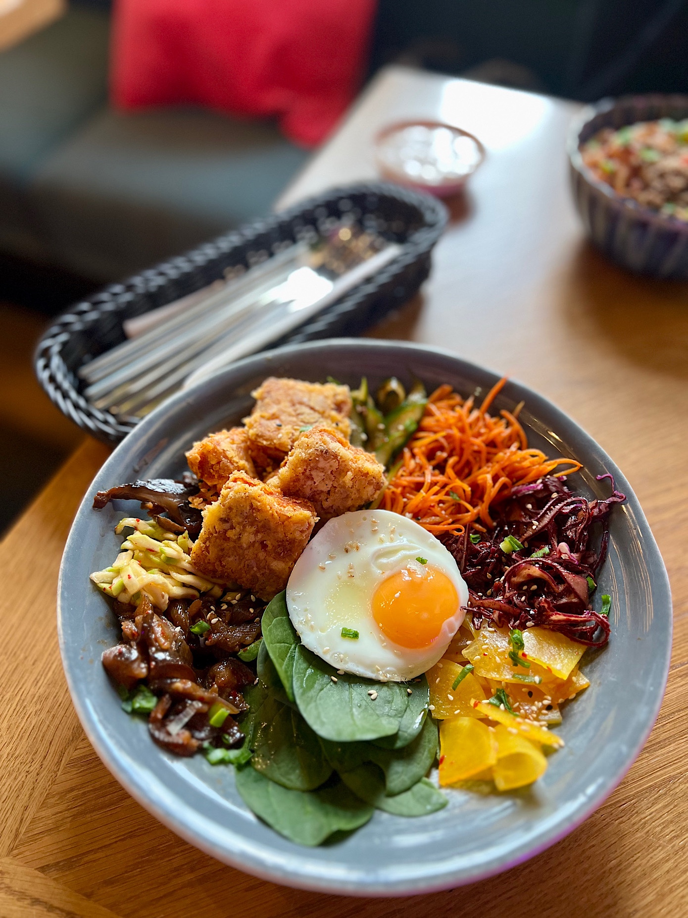 Bibimbap (42 PLN) czyli ryż z warzywami i dodatkiem głównym również perfekt. Nie odstaje w żaden sposób od mojego ulubionego z Oriental Spoon. Ryż pyszny, warzywa słodkie lub lekko pikantne, świeże i marynowane, octowe, tofu aksamitne i ekstremalnie delikatne. Fajne! Zamówcie go z autorskim sosem. Koniecznie!