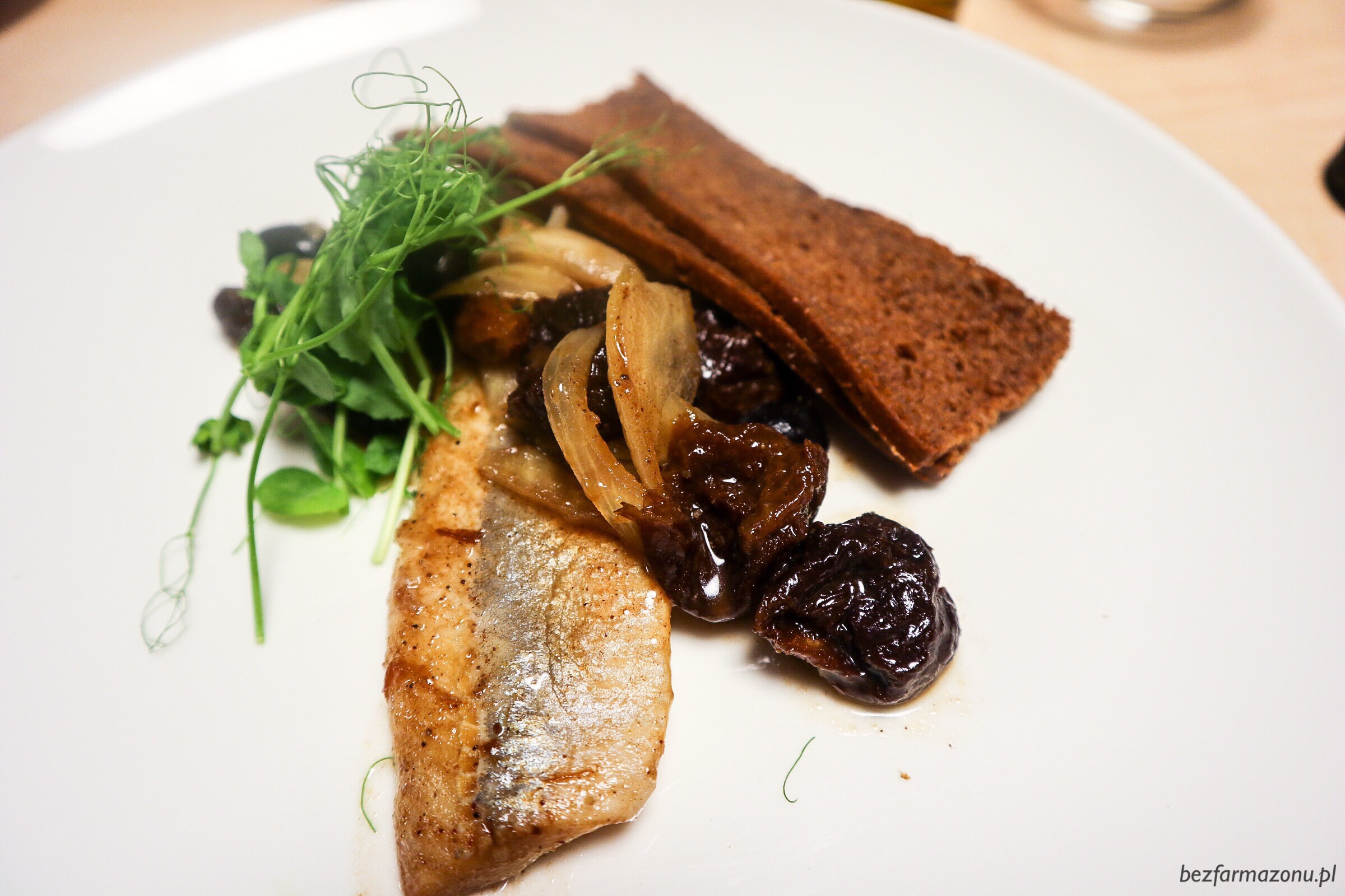 Śledź z chlebem piernikowym, przyprawami korzennymi i oliwkami (18 PLN) był jednym z lepszych rybnych talerzy jakie ostatnio jadłem (a trochę ich teraz w trakcie grudniowej #pescovege diety probuję). Ryba niezbyt słona, twarda i nie rozlazła. Z doskonale słodkim sosem z rodzynkami oraz kontrapunktującymi je oliwkami i świetnym chlebkiem dobrze pieściła podniebienie. Brać w ciemno!