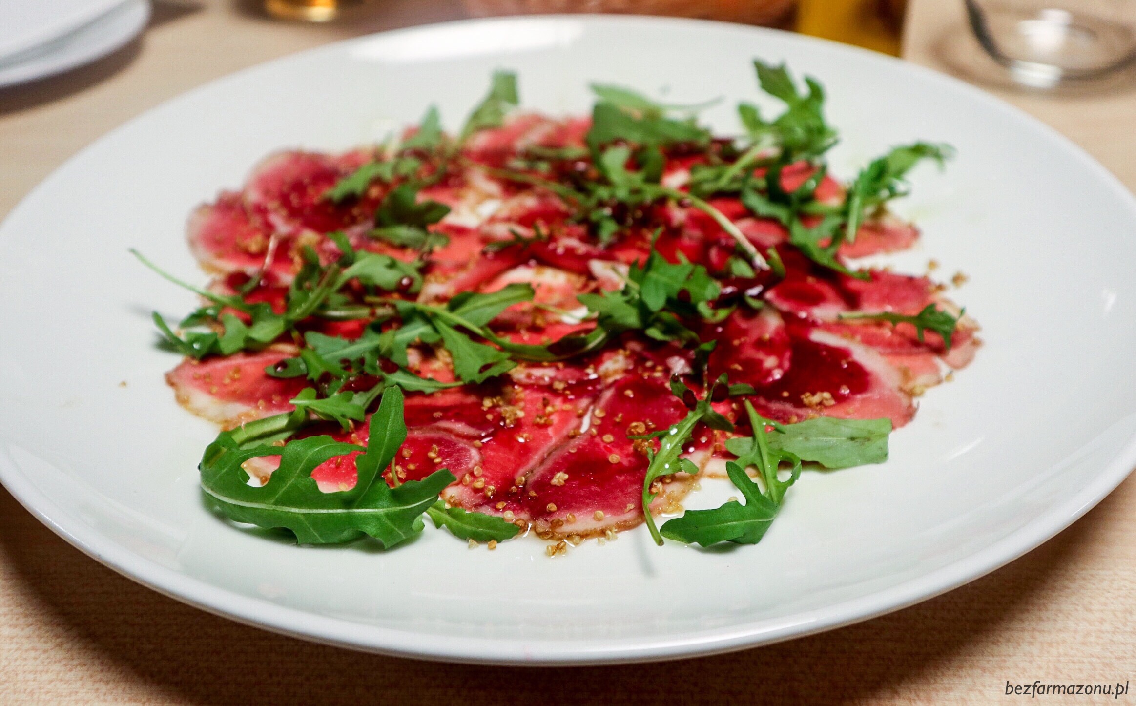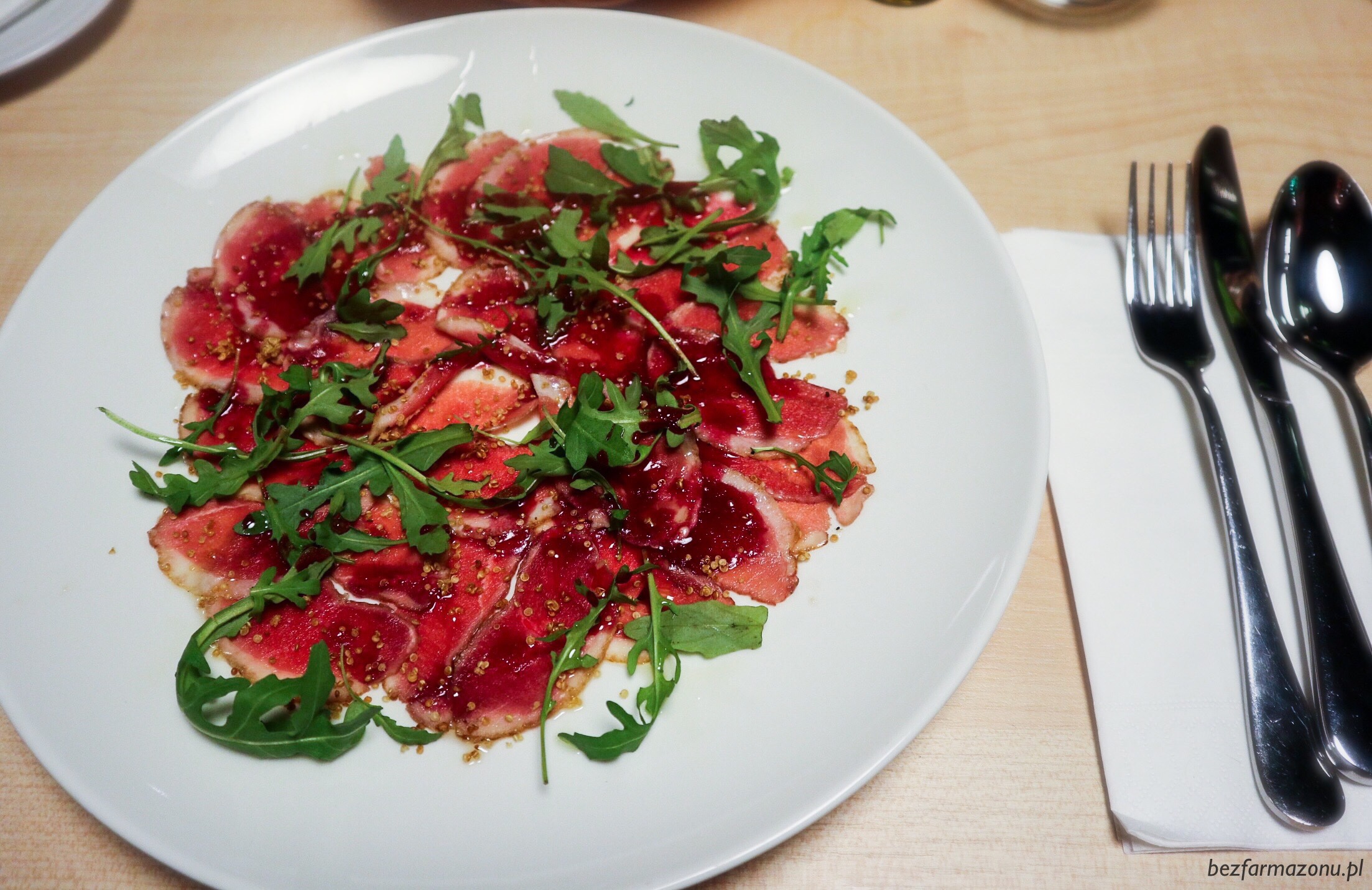 Carpaccio z kaczki z wiśniowym dressingiem (ze świątecznej wkładki) zmyślne, aczkolwiek przez sporą ilość kwaśnego sosu, smak drobiu był niemalże niewyczuwalny.