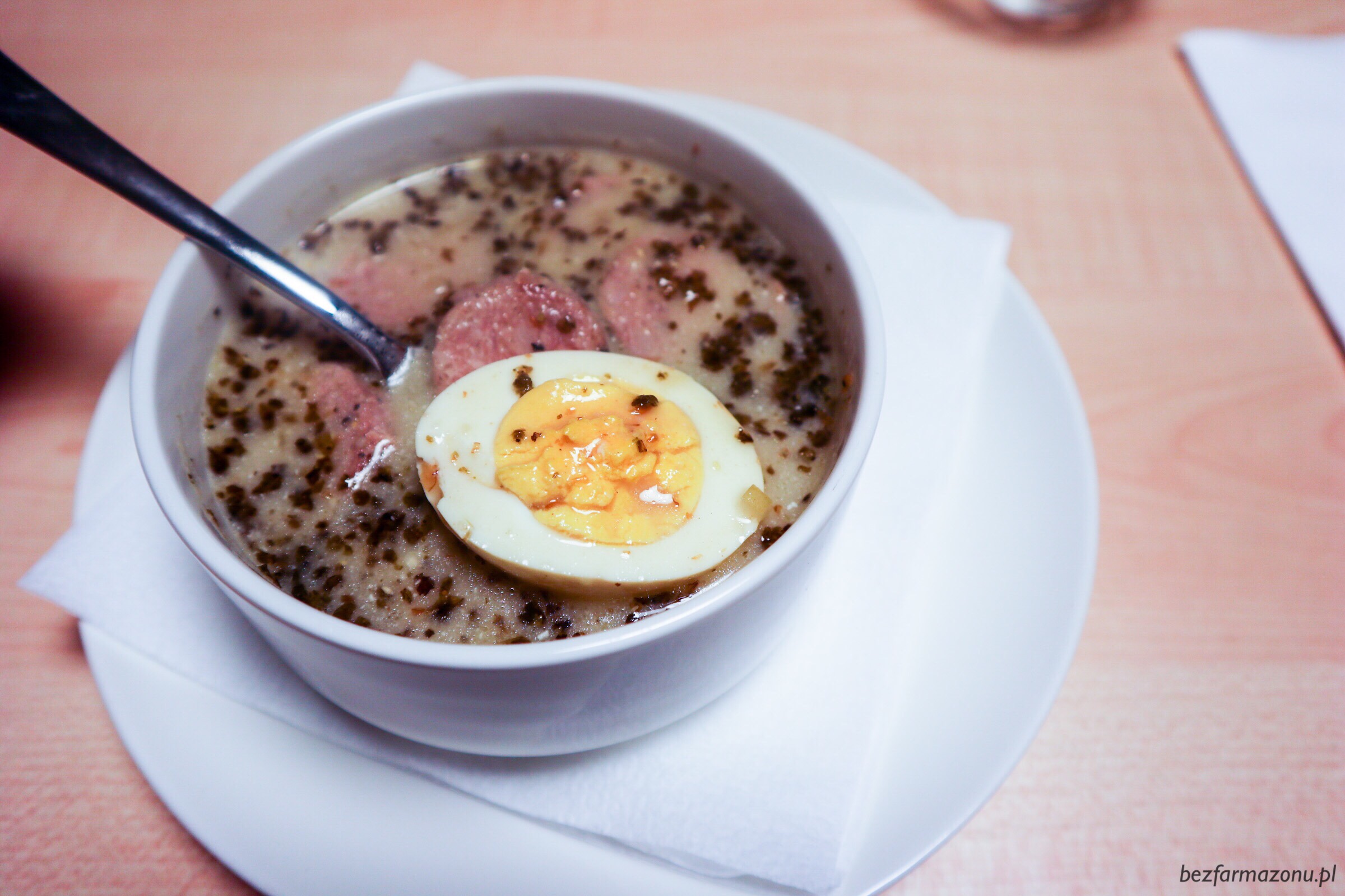 Żurek z jajkiem (13 PLN). Gorący, z połową jajka, bez ziemniaków, ale z bardzo dużą ilością kawałków kiełbachy.