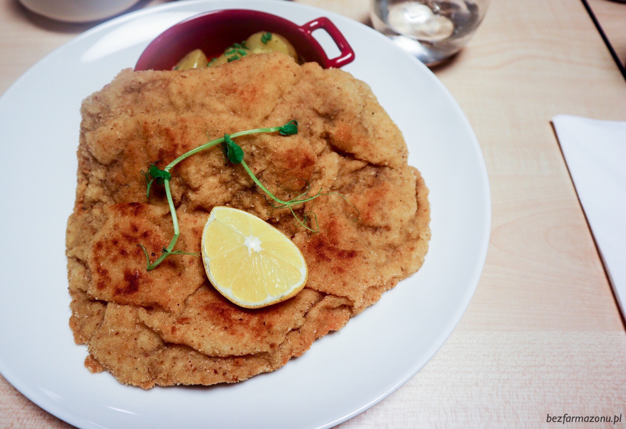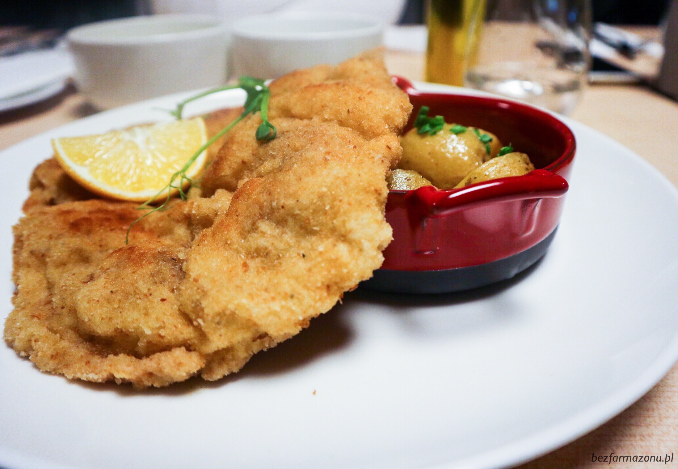 Wiener Schnitzel z gotowanymi ziemniaczkami i sosem holenderskim (52 PLN) swoje kosztuje, ale to nie jest wieprzowina tylko cielęcina, a za dobrej jakości mięso trzeba kilka złotych więcej zapłacić. Także nie porównujcie go do świńskich schaboszczaków. DB nie podołał całej porcji.