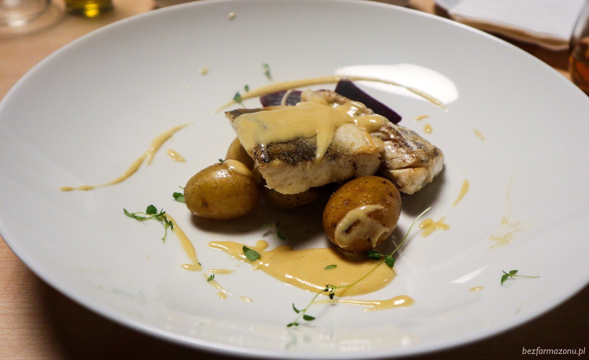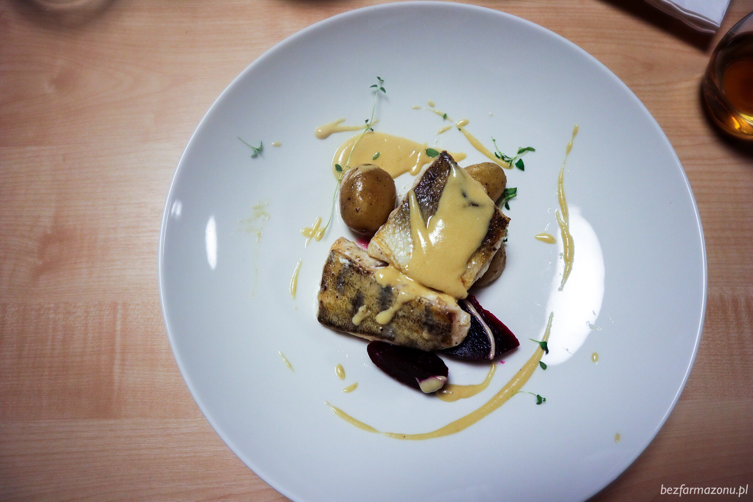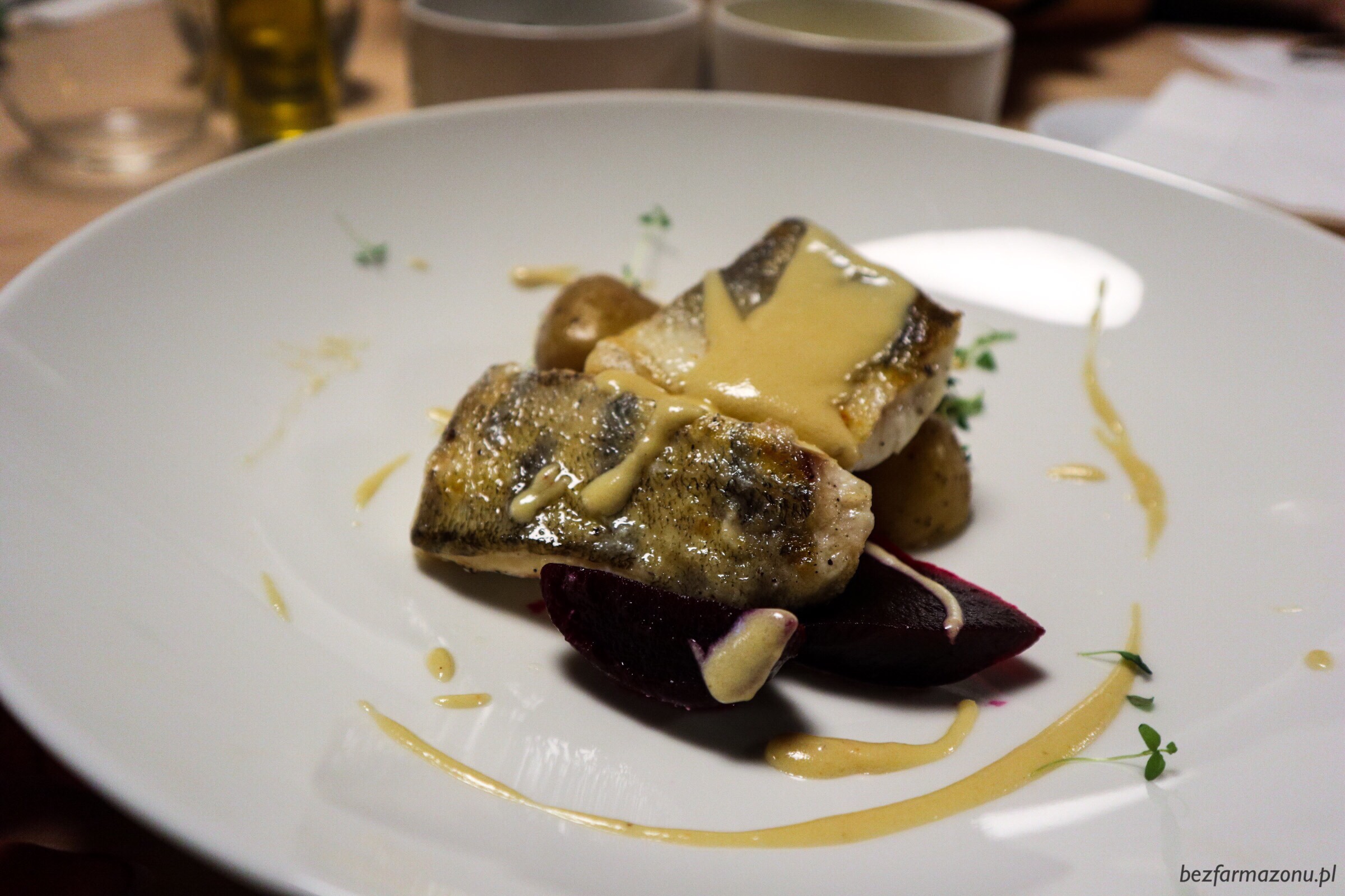 Sandacz z marynowanym burakiem, gotowanymi ziemniaczkami i sosem z białego wina (ze świątecznej wkładki). Delikatne mięso właściwie komponowało się z białym, gęstym sosem. Porcja mogłaby być większa.