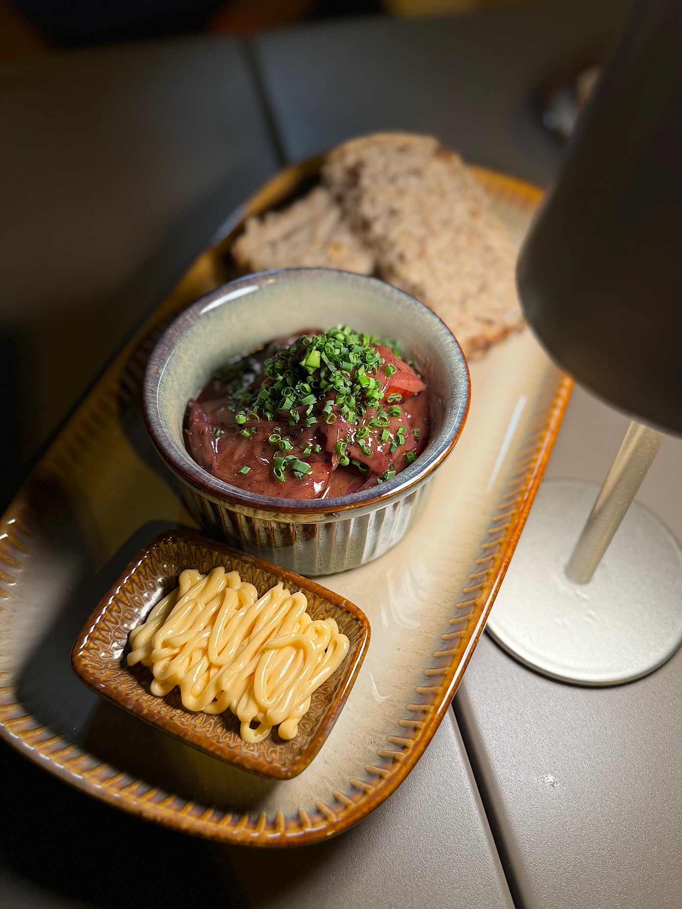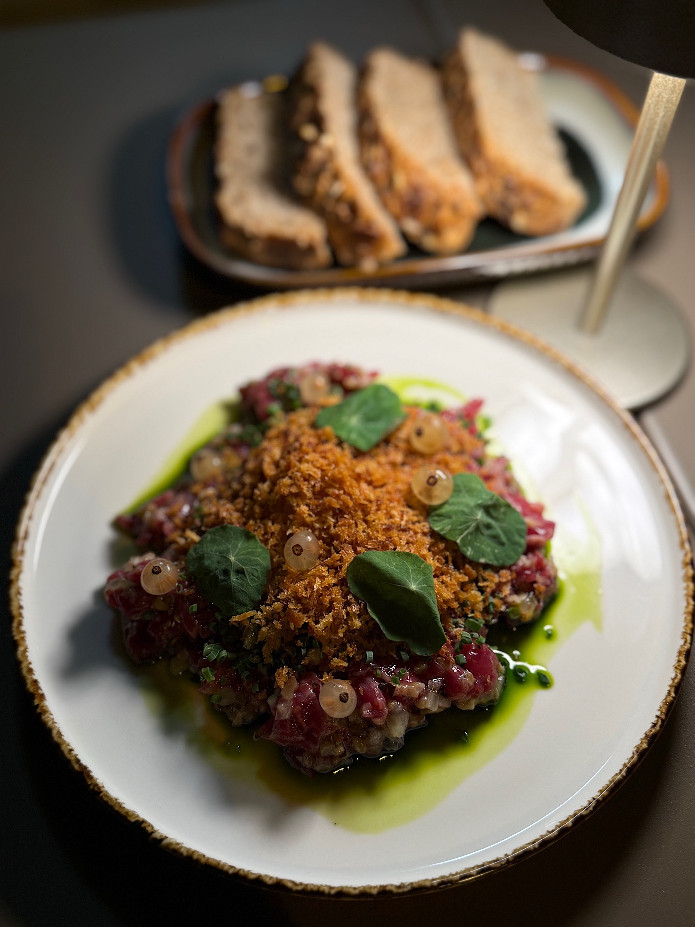 TATAR Z POLĘDWICY WOŁOWEJ (54 PLN) – ogórek małosolny | podgrzybek marynowany | jajko. Działo się tu sporo i niestety nie było czuć ani mięsa, ani klasycznych dodatków. Pangrattato z gęsiego tłuszczu oraz lubczyk i nasturcja kompletnie zawładnęły daniem. Płacąc 54 złote chleba oczekuję już w zestawie chleba, a nie za dodatkowe 10 złotych. Zawsze i wszędzie będę to bojkotował i wypominał. Tatar i pieczywo to zestaw nierozłączny i nie jest fair, aby za pieczywo płacić dodatkowo!
