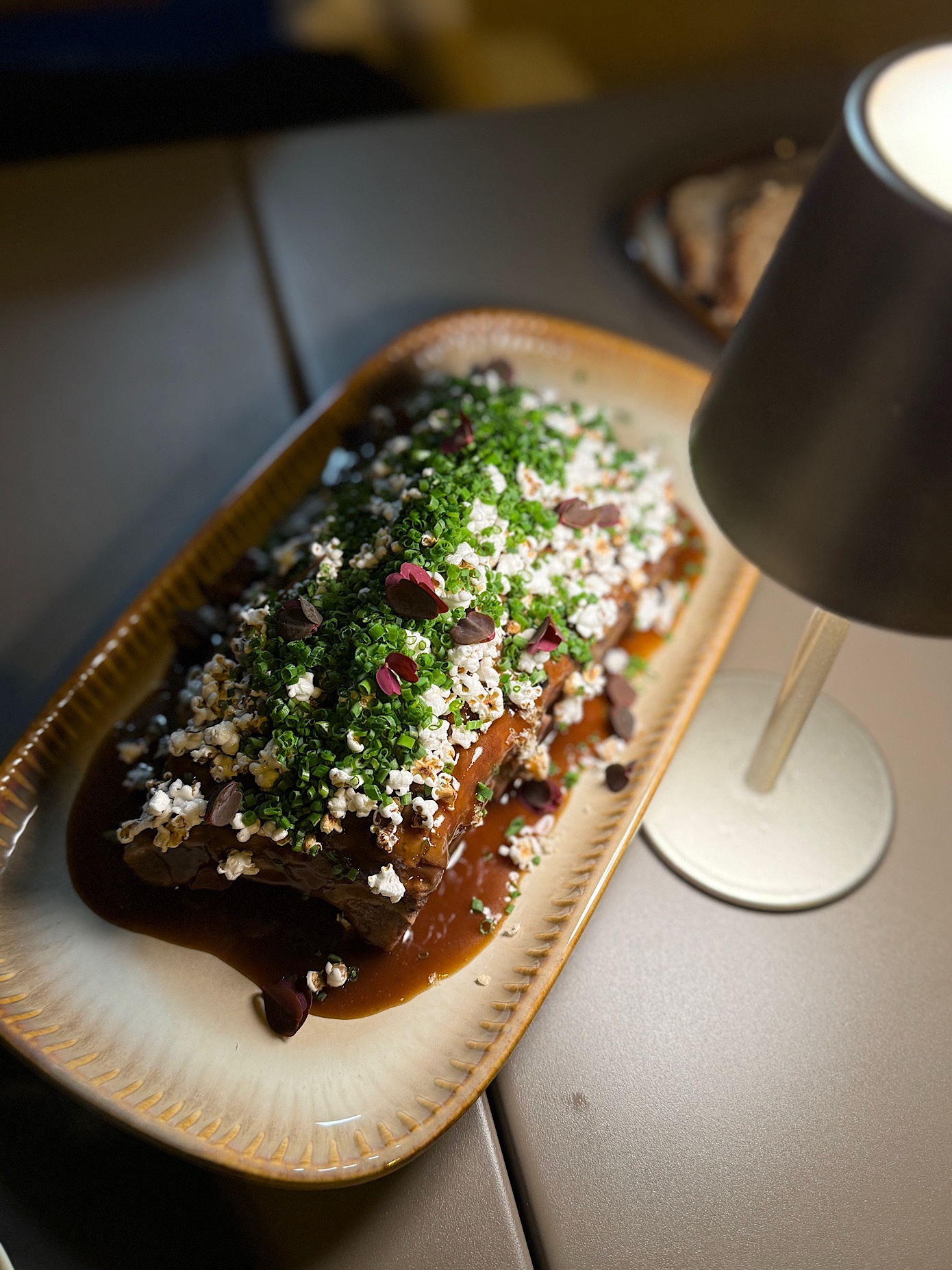 ŻEBERKA DUSZONE W CIEMNYM, RZEMIEŚLNICZYM PIWIE (46 PLN) – sorgo | chrzan | szczypiorek. Ekstremalnie intensywny smak mięsa za sprawą duszenia w piwie i goździkach dosłownie rozszarpywał nozdrza. Sorgo nie widziałem w Krk jeszcze nigdzie, a to bardzo smaczne zboże – i do tego bezglutenowe! Gęsty sos ambrozja 🙂