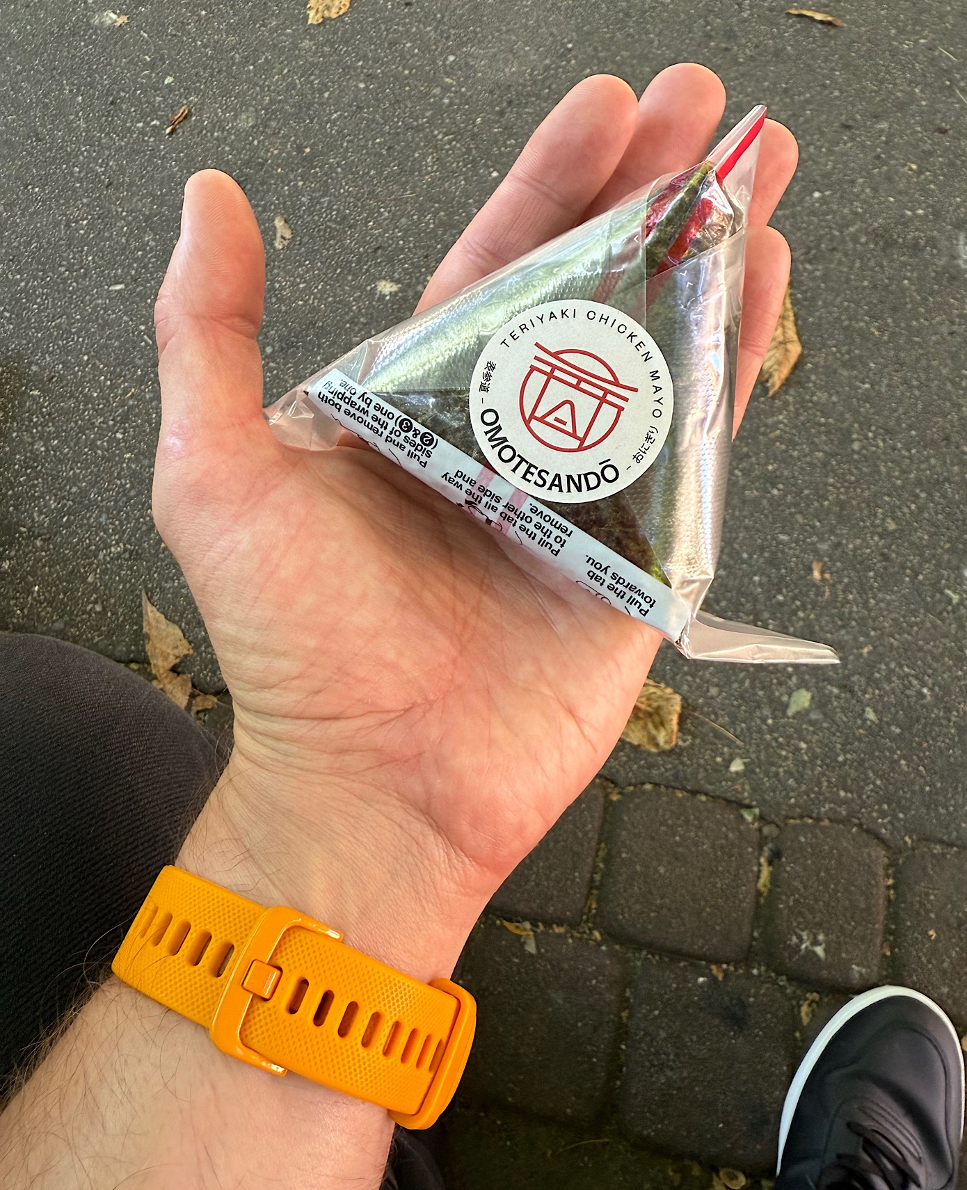 Z kolegą z robo Ł, w sierpniu 2025 spróbowaliśmy czterech smaków (na foto załapały się dwa). I wiecie co? Każde onigiri smakowało kompletnie inaczej.
