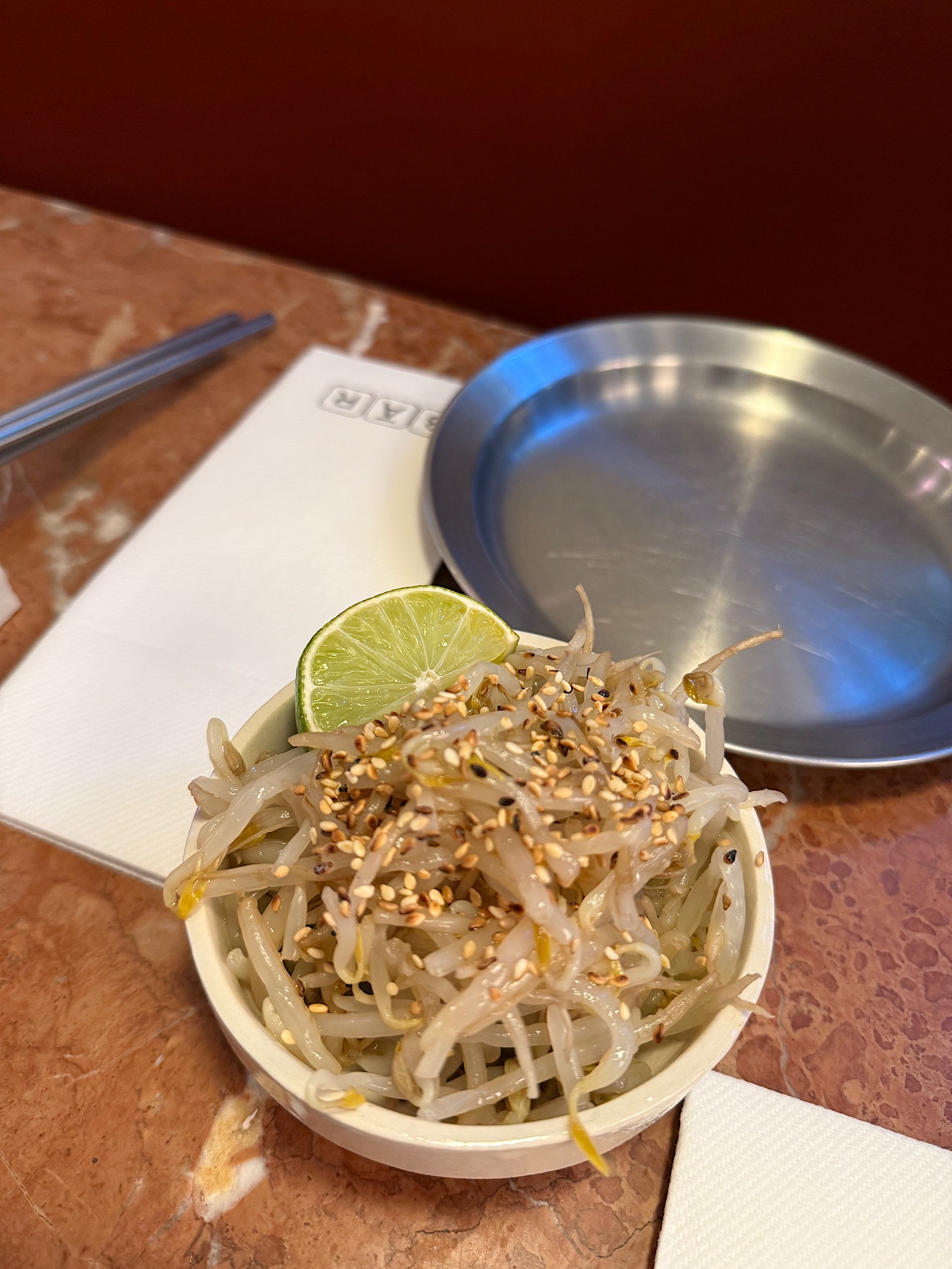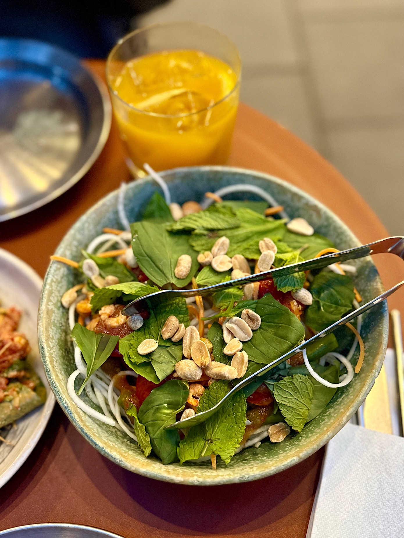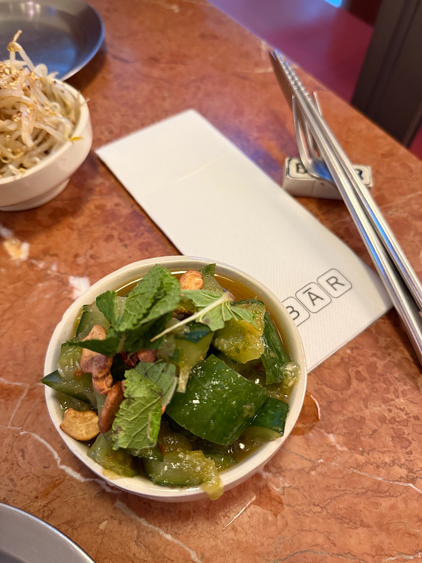 Na start wpadły kiełki mung z sezamem i limonką (13 PLN) oraz ogórek z nerkowcami, kimchi i miętą (14 PLN). Obydwie miseczki rześkie i przyjemne.