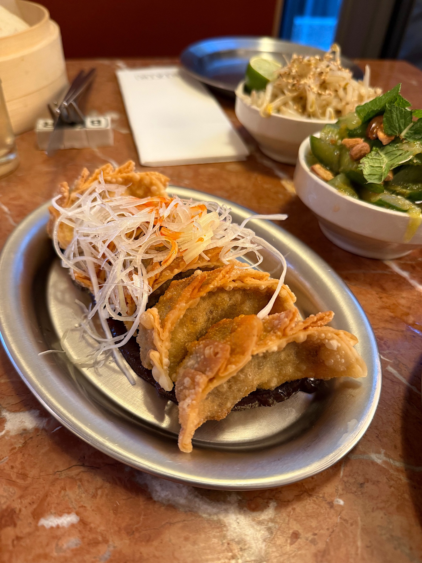 Gyozy z kaczką z głębokiego tłuszczu charakteryzowały się tłustym i niesprężystym ciastem i to sprawiało wrażenie bardzo ciężkich. Drobiowy farsz nie porwał, fenomenalnym okazał się gęsty i słodki sos hoisin (44 PLN).
