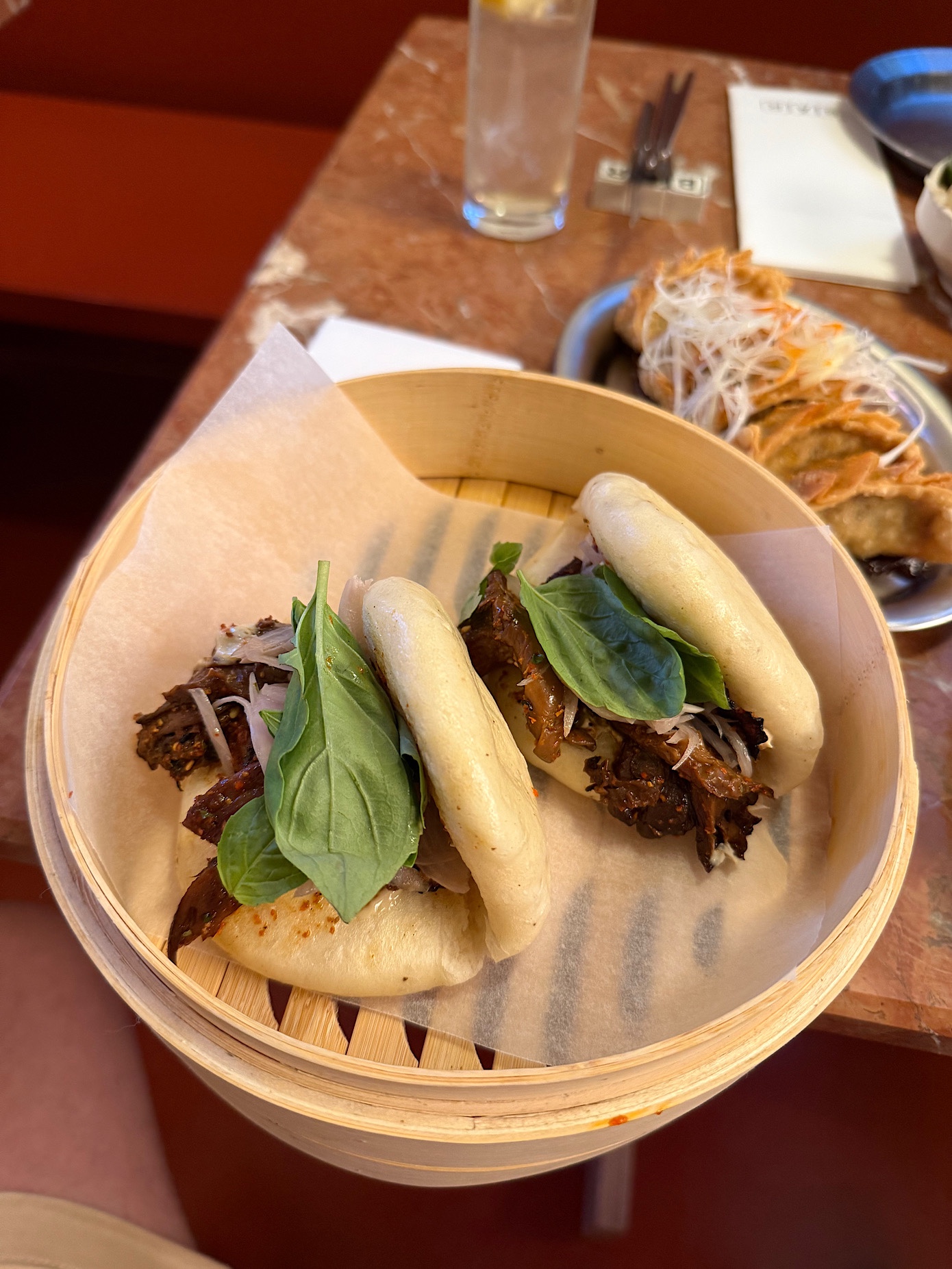 Bułeczki bao z marynowanym boczniakem, piklowaną szalotką i borowikowym majonezem (33 PLN) puszyste i mięciuchne z wyrazistymi grzybami, ale podane zimne, co dla mnie przekreśliło wszystkie pozytywne walory.