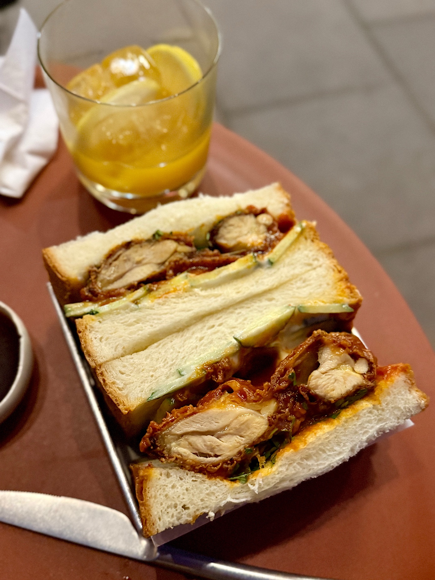 Kanapka w shokupanie z panierowanym kurakiem kukurydzianym w paście gochujang z ogórkiem i kolendrą (36 PLN) mimo paskudnego chemicznego zielepactwa sztosowa – soczysta i chrupiąca – komfortowa na maksa!