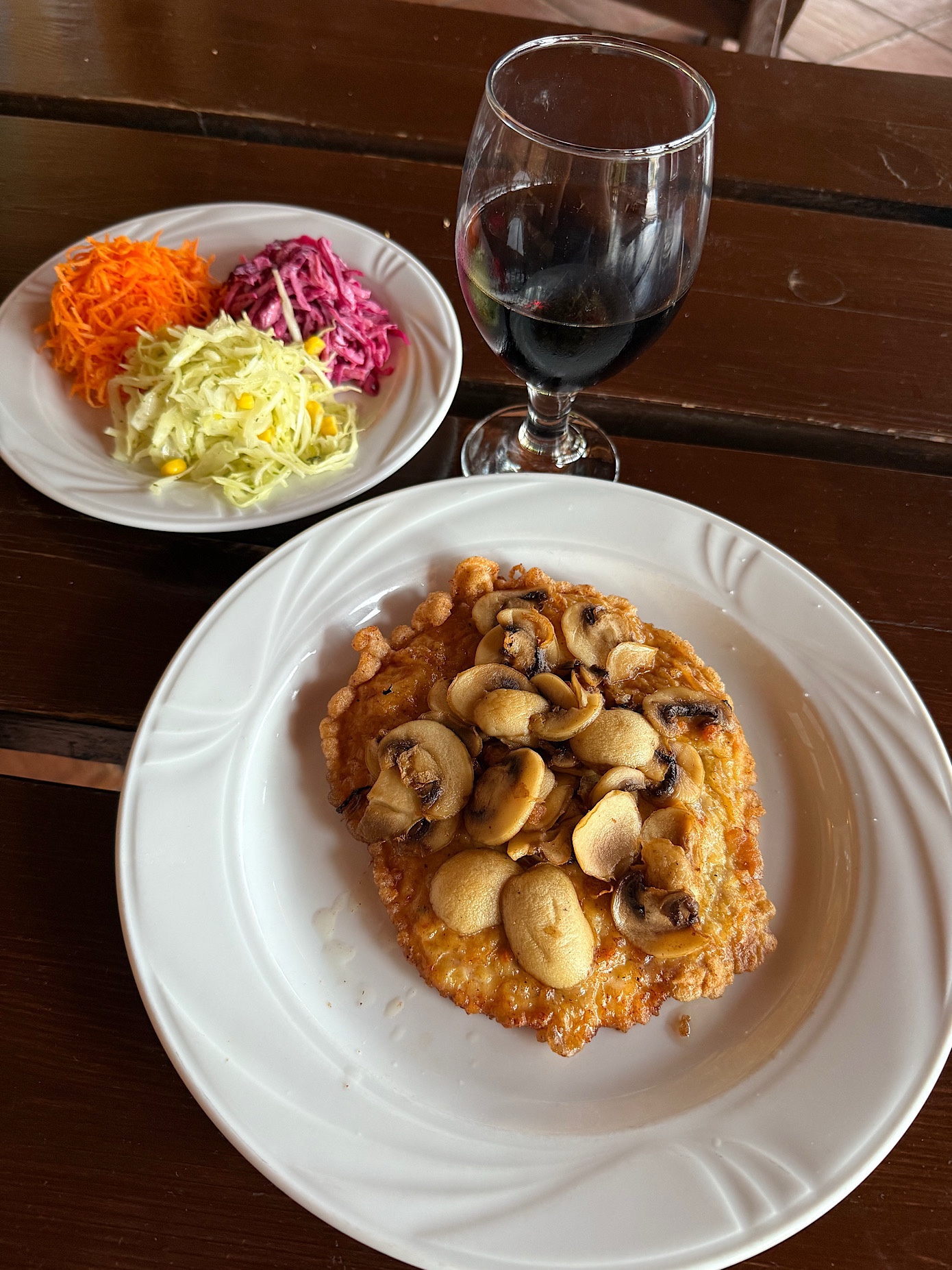 Powrót po latach do Karczmy Natury w sierpniu 2025 zaowocował testem schabowego z pieczarkami (25 PLN) z zestawem surówek (14 PLN).