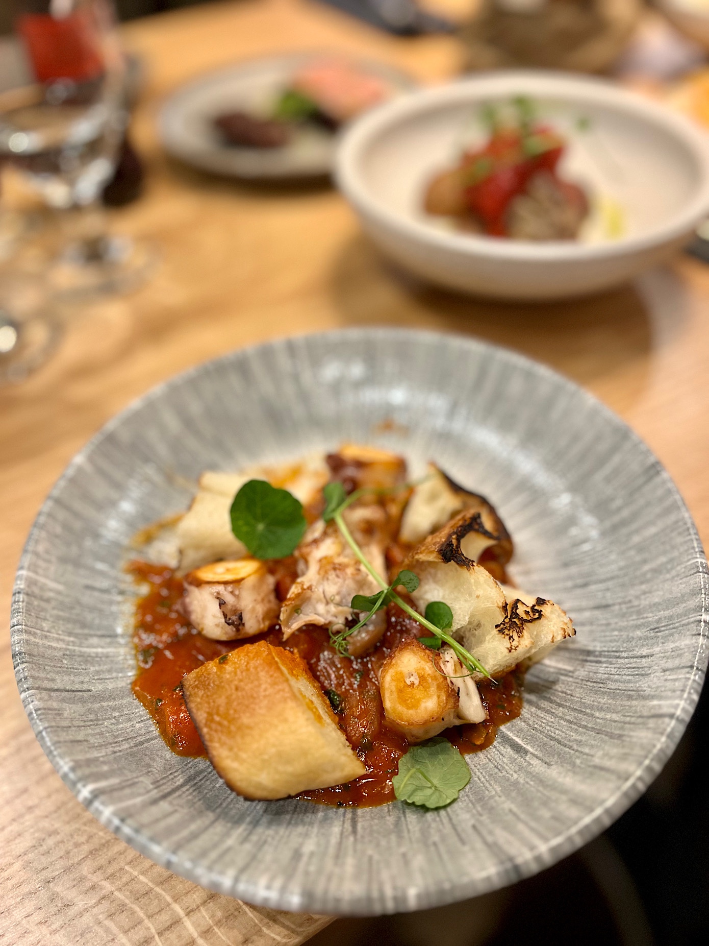 PULPO (48 PLN) czyli kawałki sprężystej ośmiornicy zestawiono z chorizo, kaparami, oliwkami i pomidorami.