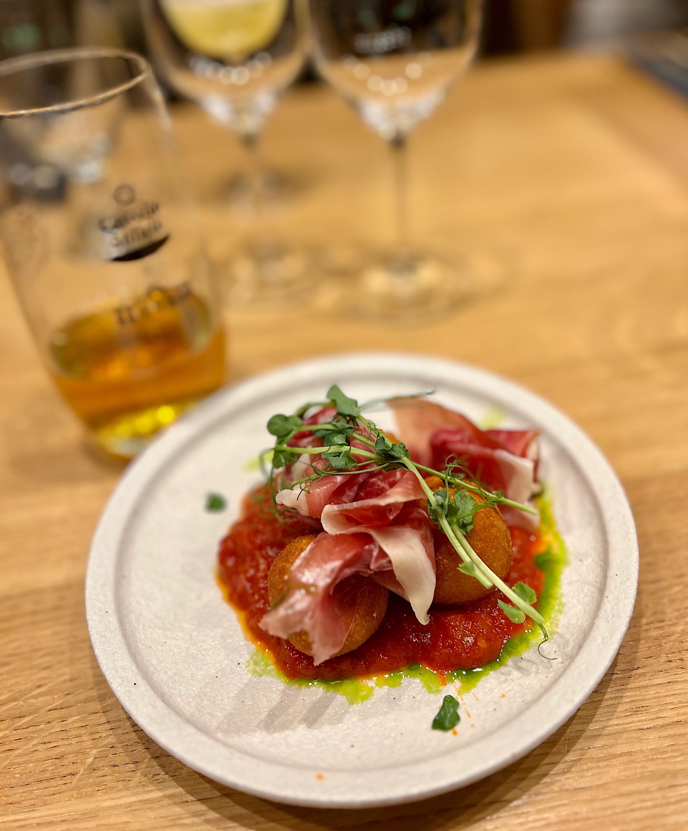 PATATAS BRAVAS (23 PLN) z aioli i pieczonym czosnkiem oraz KOZI SER (36 PLN) z bakłażanem, słodką dynią oraz salsą verde również bardzo przyjemne.