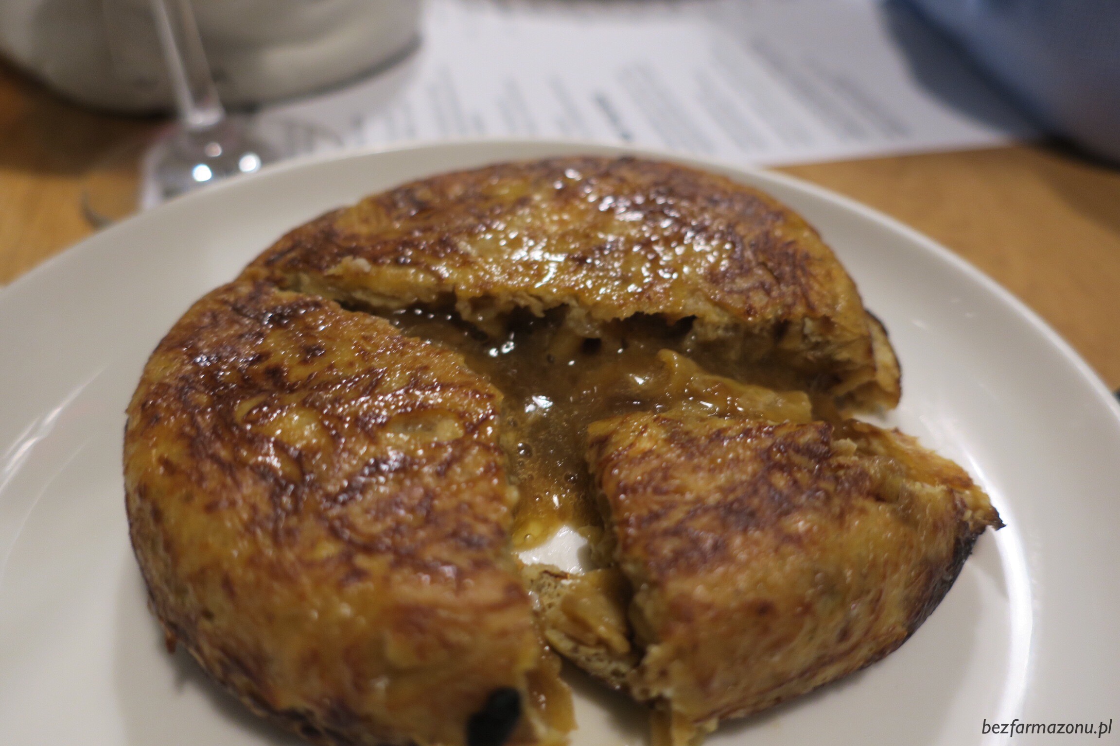 - tortille: z jaj z wolnego wybiegu (16 PLN) oraz z jaj z krewetkami i chorizo (22 PLN) wywołały żywe dyskusje. P. oraz J. debatowali o oryginalności oraz pochodzeniu tego dania. Tak szczerze, nie miało dla mnie żadnego znaczenia z którego regionu są owe „omlety”, gdyż po prostu były bardzo dobre. Po przekrojeniu, ze środka wylała się mięciutka i aromatyczna cebulka oraz kawałeczki chorizo i krewetek (w tej drugiej).