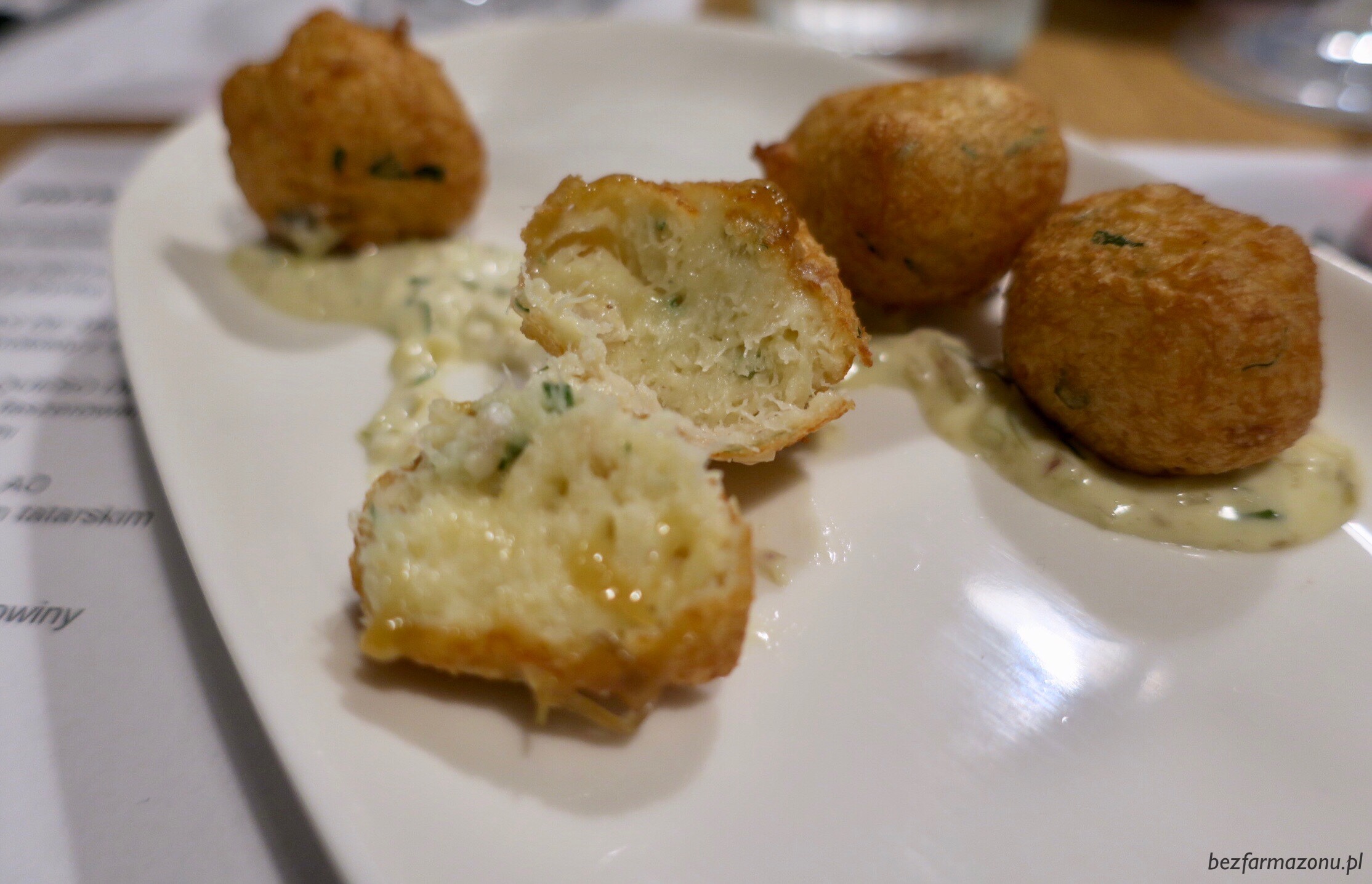 - ułożone na świetnym sosie tatarskim z wyczuwalnymi ogórkami, krokiety z dorsza (10 PLN) zawierały w sobie jedną z moich ulubionych ryb. W porównaniu do kulek z szynką łagodniejsze i mniej kleiste.