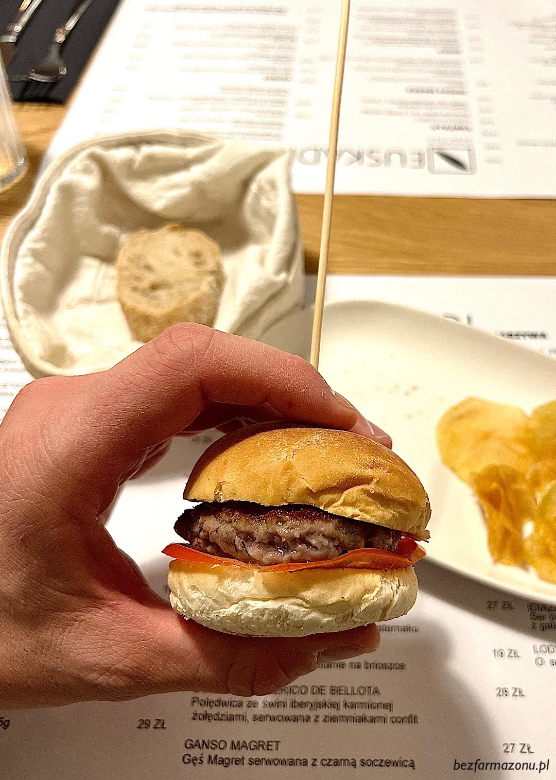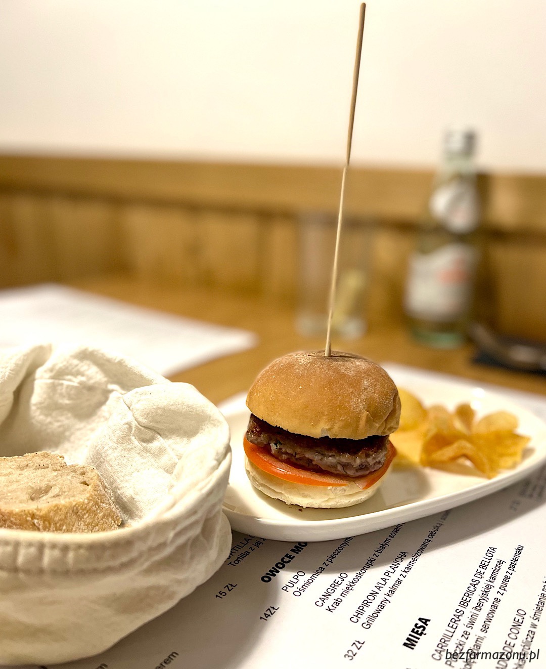 Pierwsza pojawiła się Hamburguesa (14 PLN). Miniburger z iberyjskiej wieprzowiny przywołał na myśl niedzielnego mielonego przygotowanego z perfekcyjnie smacznego świniaka. Gładka jak chmurka mini bułka skrywała plaster pomidora i ogórka, a zaserwowano ją w towarzystwie garstki domowych chipsów.