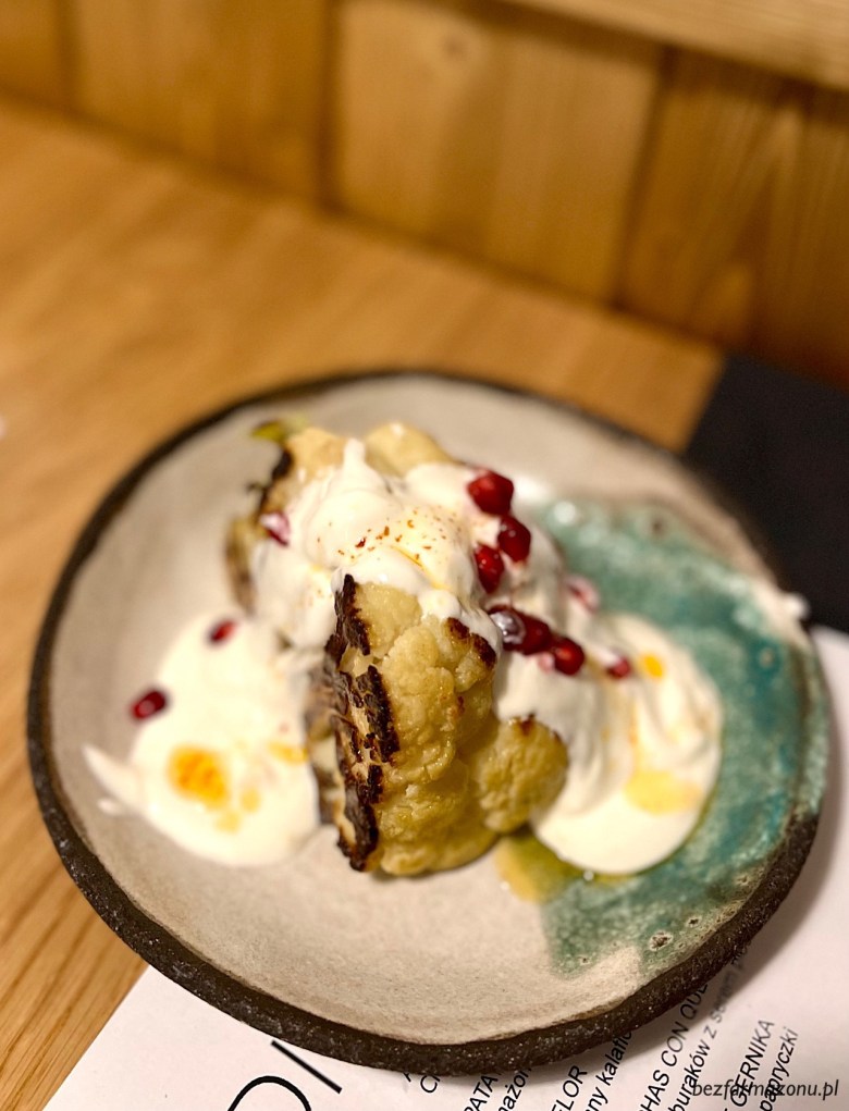 Z sekcji warzyw wege sercem zawładnął delikatnie zaogniony z zewnątrz grillowany kalafior (19 PLN) z jogurtem oraz granatem. Niby zwykły kalafior, ale serio wyborny – sprężysty na zewnątrz, kremowy w środku. Świetny pomysł na odtworzenie w domu.