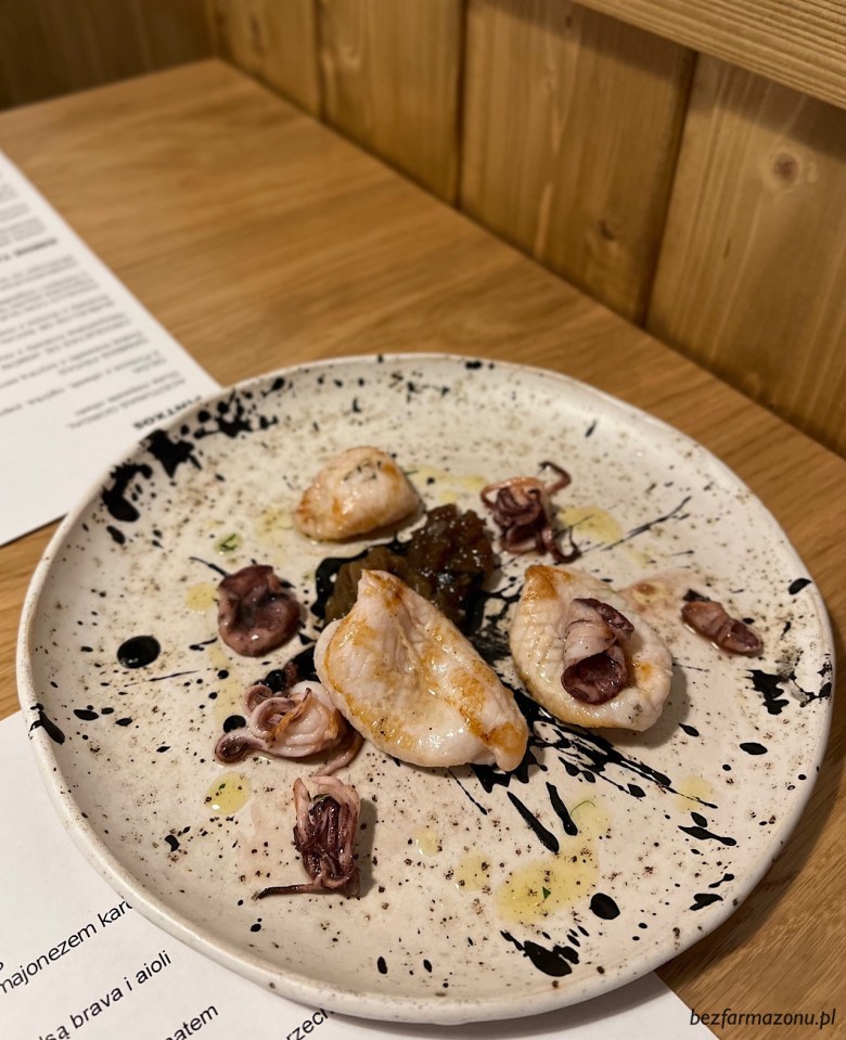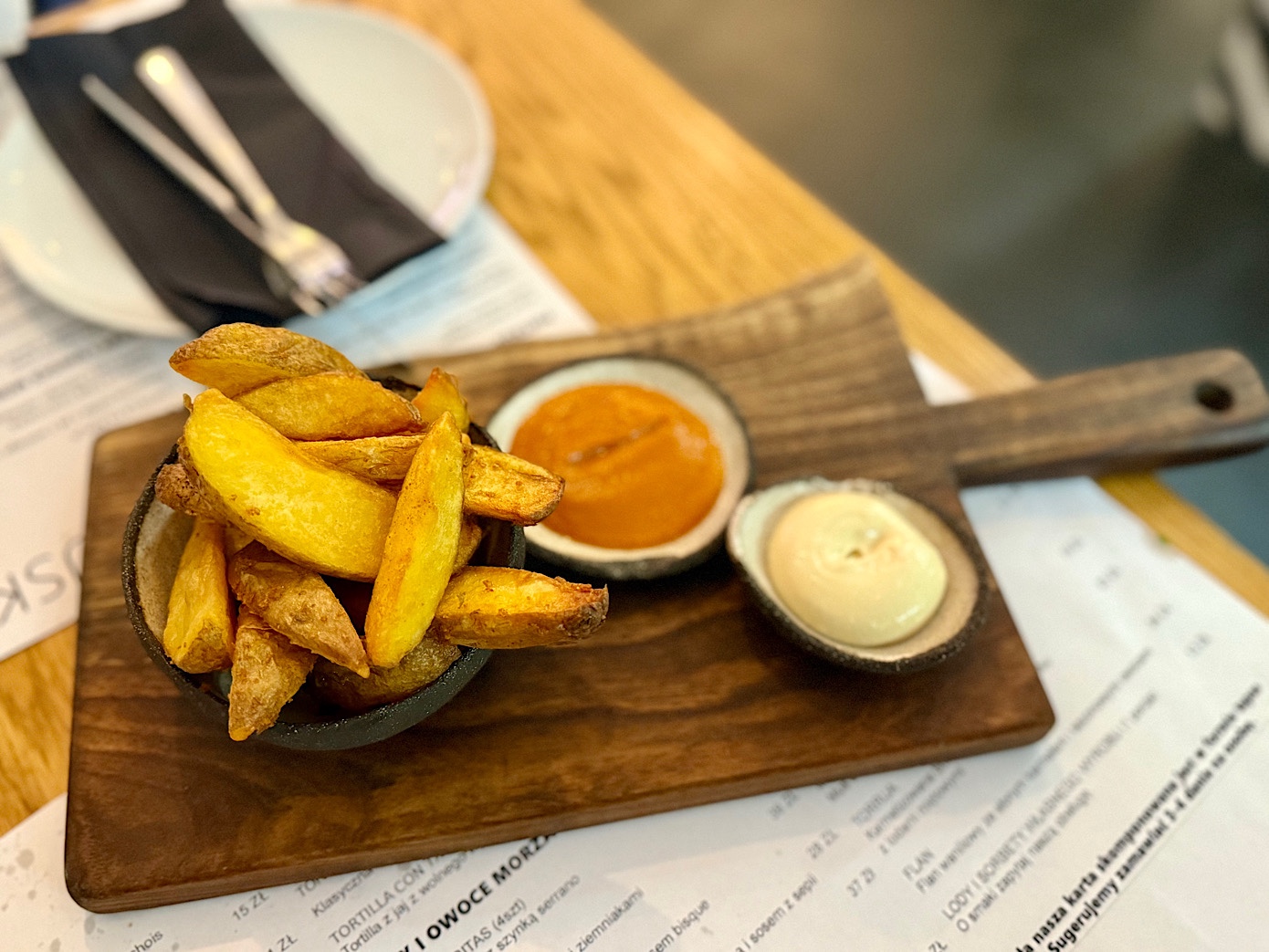 - smażone ziemniaki z super chrupiącą skórką podawane z pomidorową salsą brava oraz gęstym czosnkowo – oliwnym aioli (13 PLN) polecam w ciemno do wszystkiego.