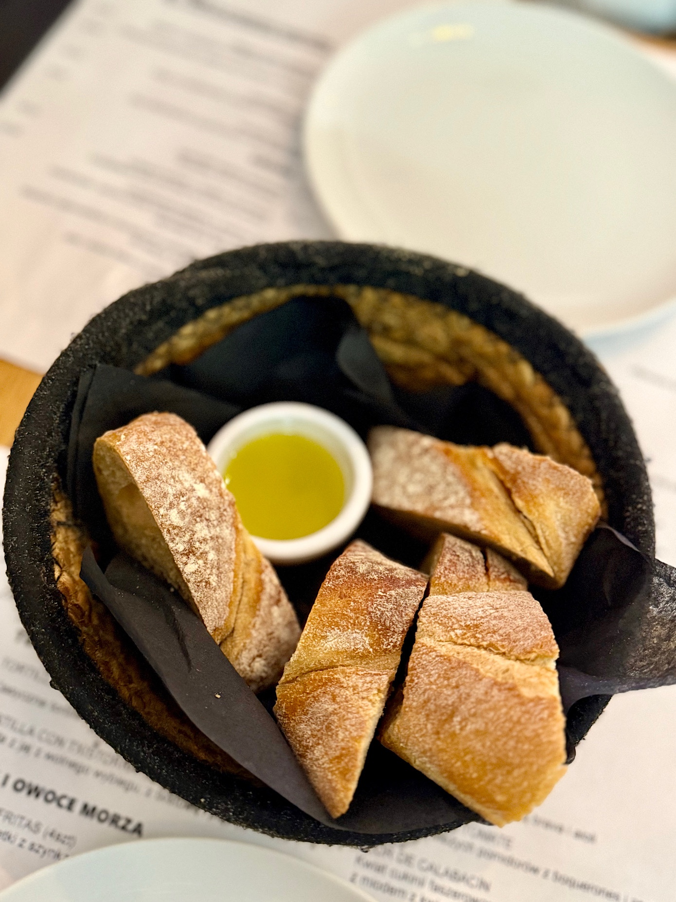 Na początek pieczywo z oliwą. Glutenowy wypiek jest przepyszny, ale radzę się oprzeć chęci zjedzenia go w całości – przyda się do kolejnych dań celem chłonięcia sosów.