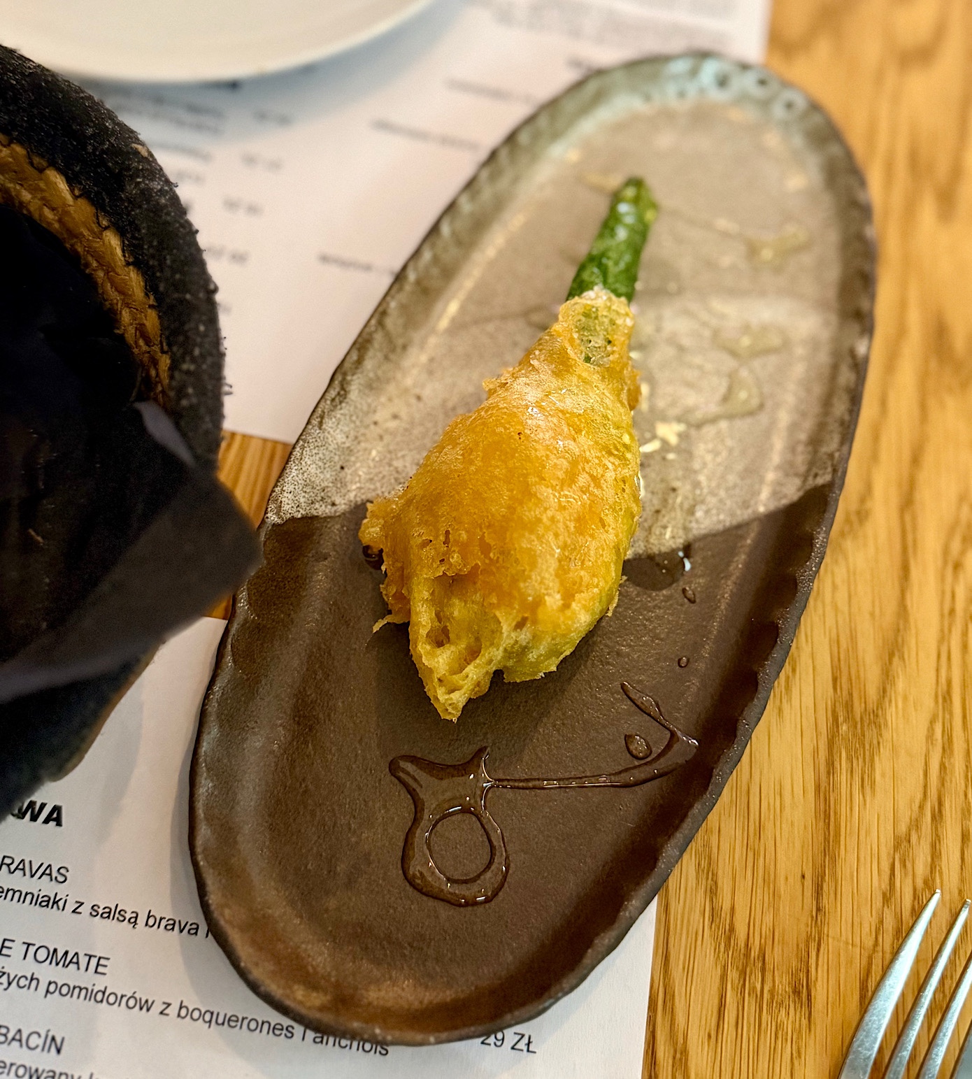 Kolejna przystawka to brandana czyli papryczka faszerowana musem z dorsza i sosem z sepii. Dużo bardziej smakowała niż krokiety. Papryka lekko ostra, mus odpowiednio doprawiony. Szkoda ze tylko jedna.