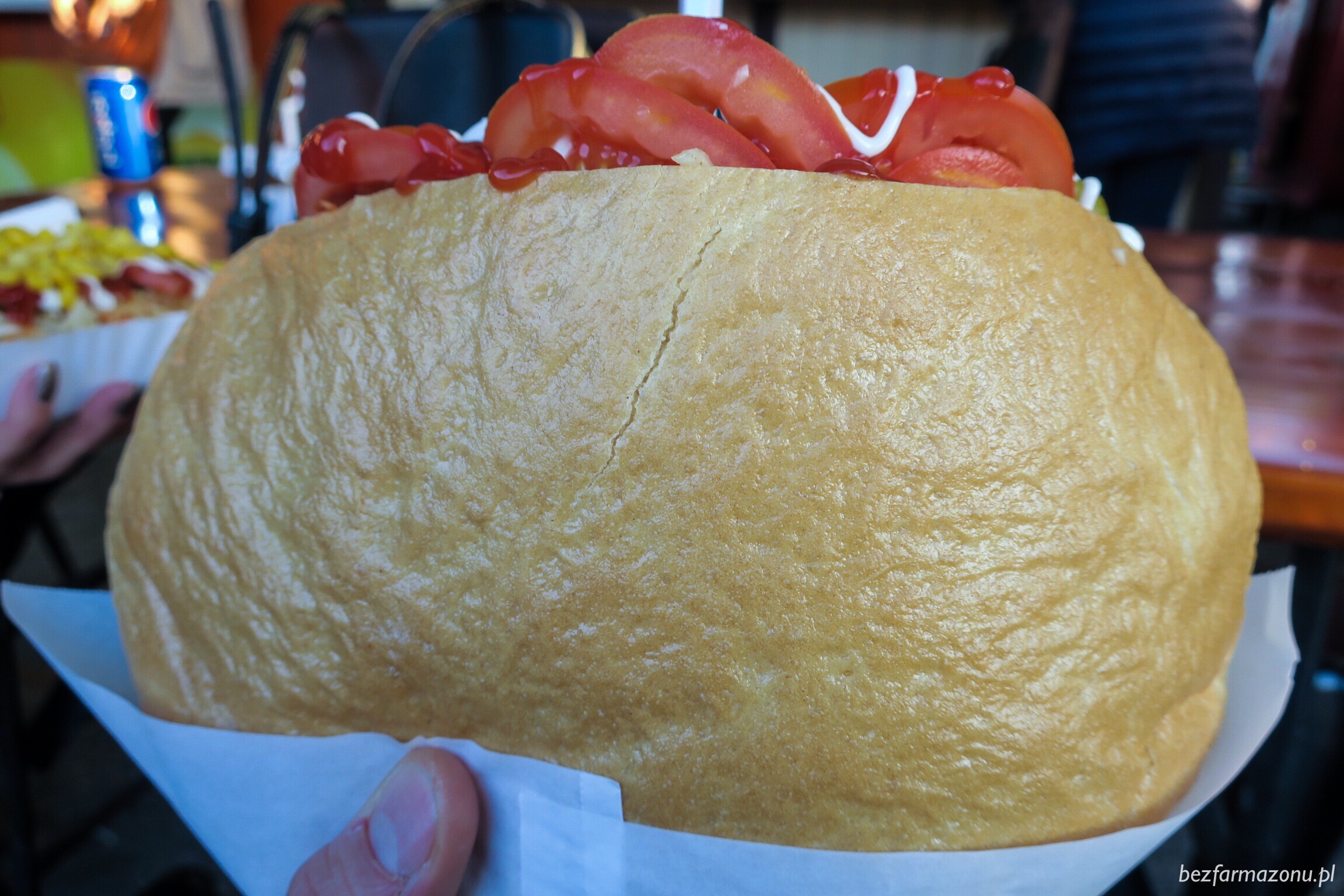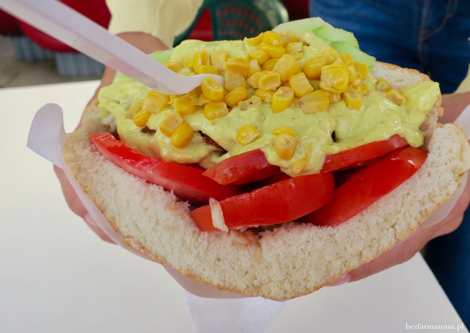 Napakowana po samą górę kukurydzą, zielonymi ogórkami, pomidorami i surówką z białej kapusty od Grześkowiaka, zwieńczona majonezem i keczupem dosłownie ciążyła na dłoni!