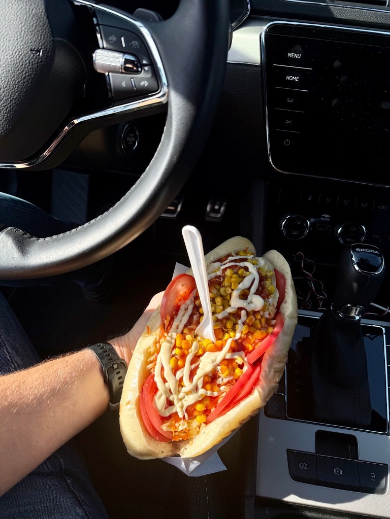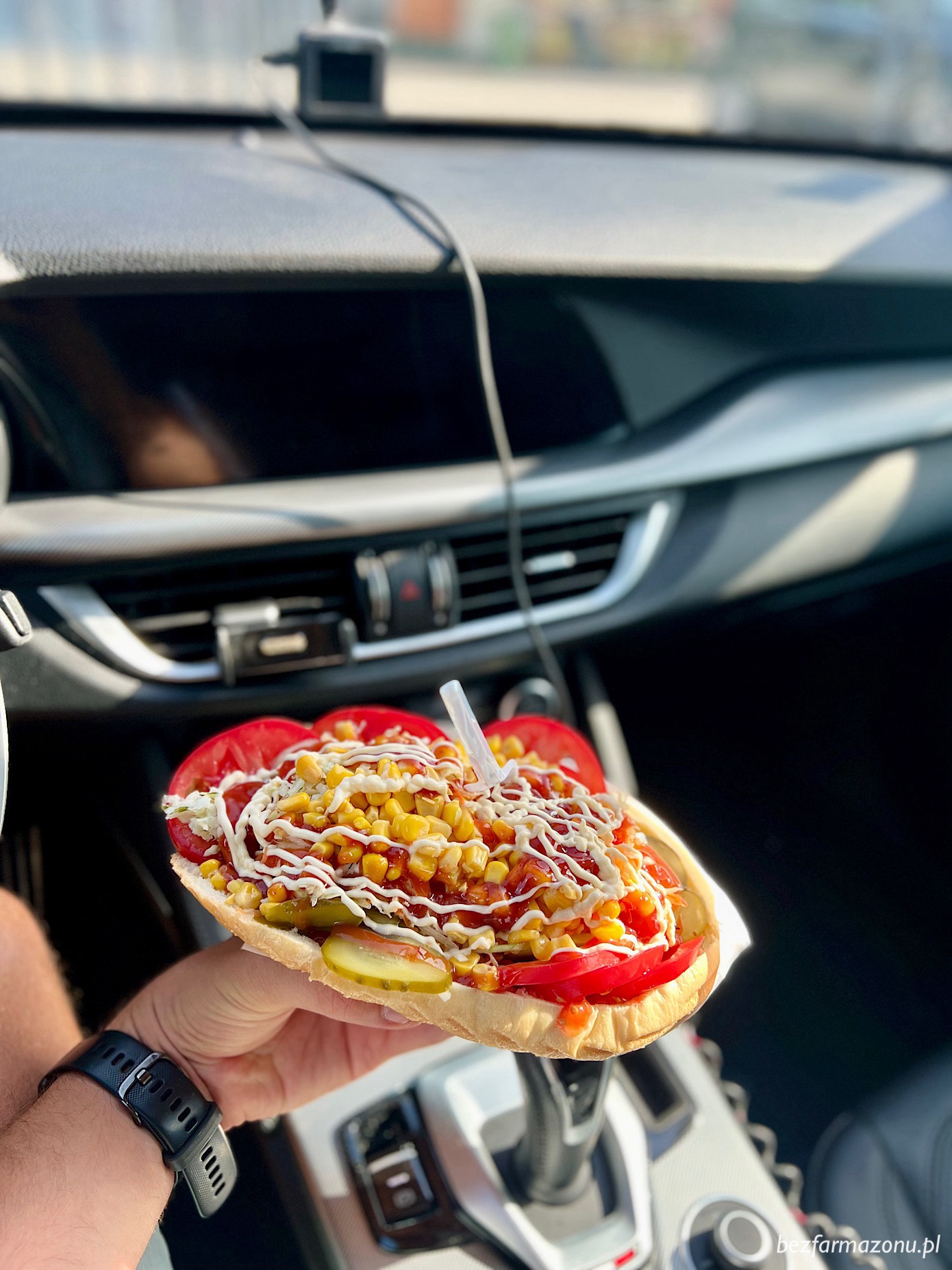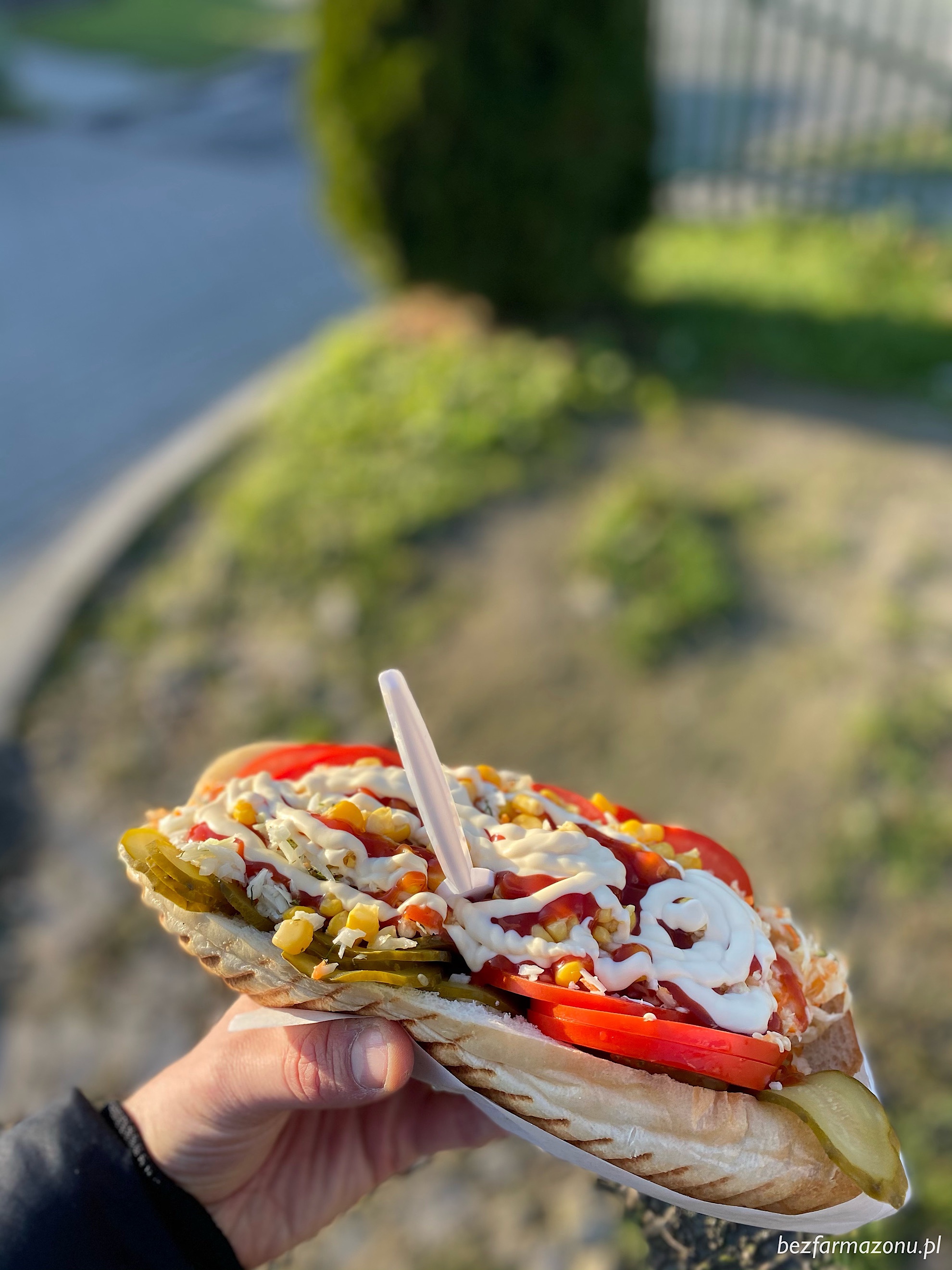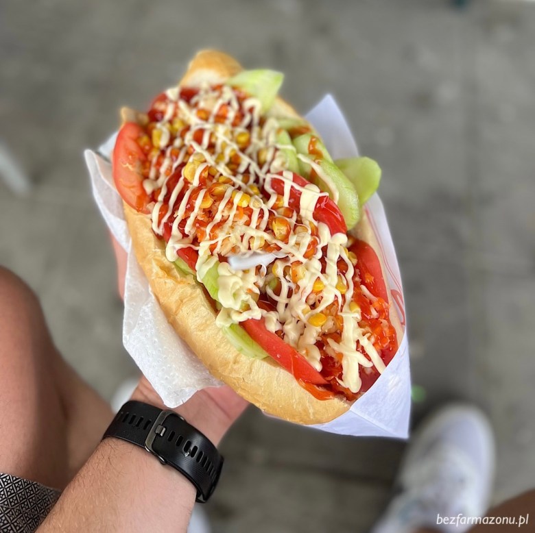 Początkiem czerwca 2022 odstałem ze dwadzieścia minut, aby dostać hot doga z warzywami (12 PLN) lecz z jedną, a nie dwoma parówkami. Sami przyznacie, że ich ilość nie determinuje ogólnej wielkości tego olbrzyma 🙂