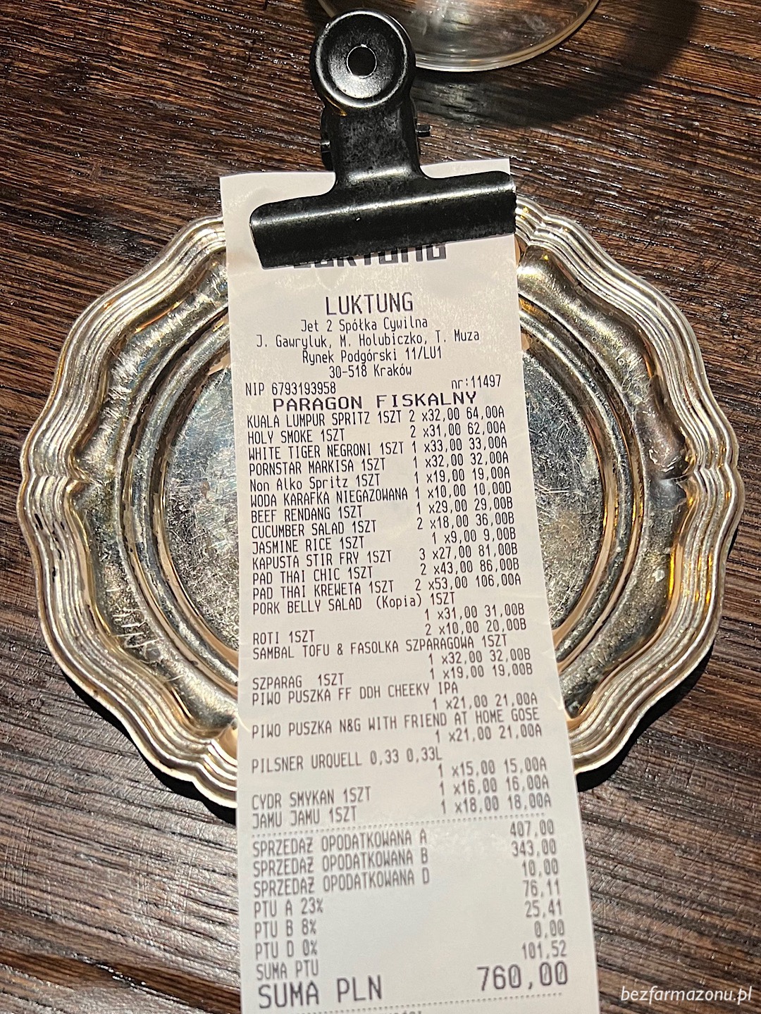 W pięciu facetów najedliśmy się i popróbowaliśmy różnych alkoholi za tyle ile pokazane jest na rachunku.
