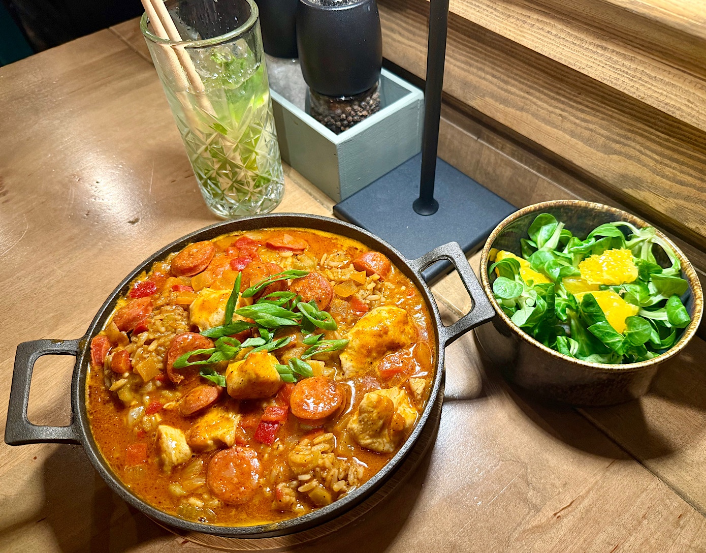 Jambalaya z chorizo i kurakiem w aromatycznym pomidorowym sosie oraz rześką sałatką z pomarańczami (49 PLN) charakteryzowała się wyrazistością i idealną pikanterią.