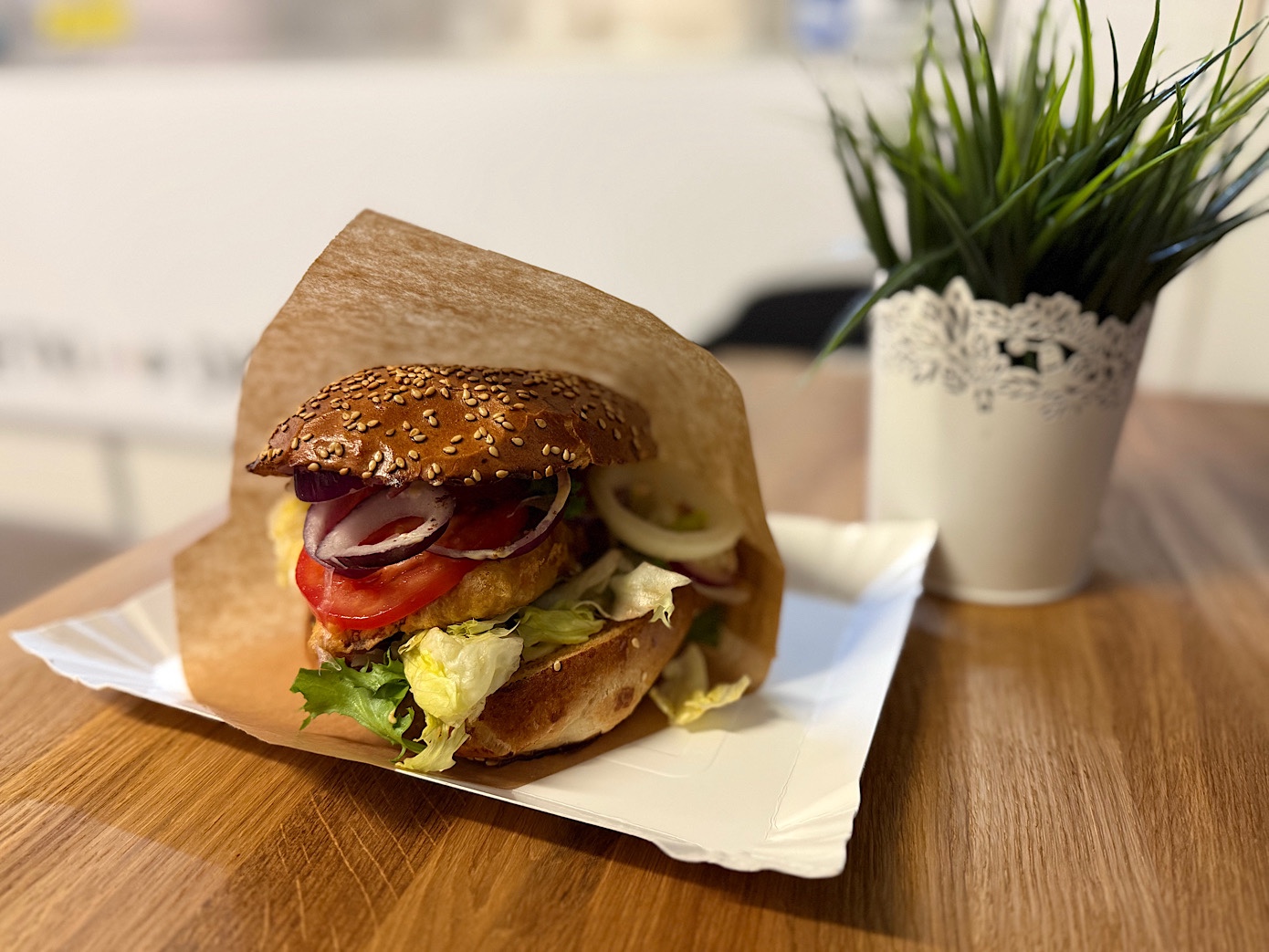 Panierowany dorsz w burgerze z sałatą, pomidorem i cebulami (32 PLN) był sztosem nad sztosy. Świetna ryba, dobra nieociekająca tłuszczem paniera, świeże warzywa i pasujący majonezowy sos aioli.