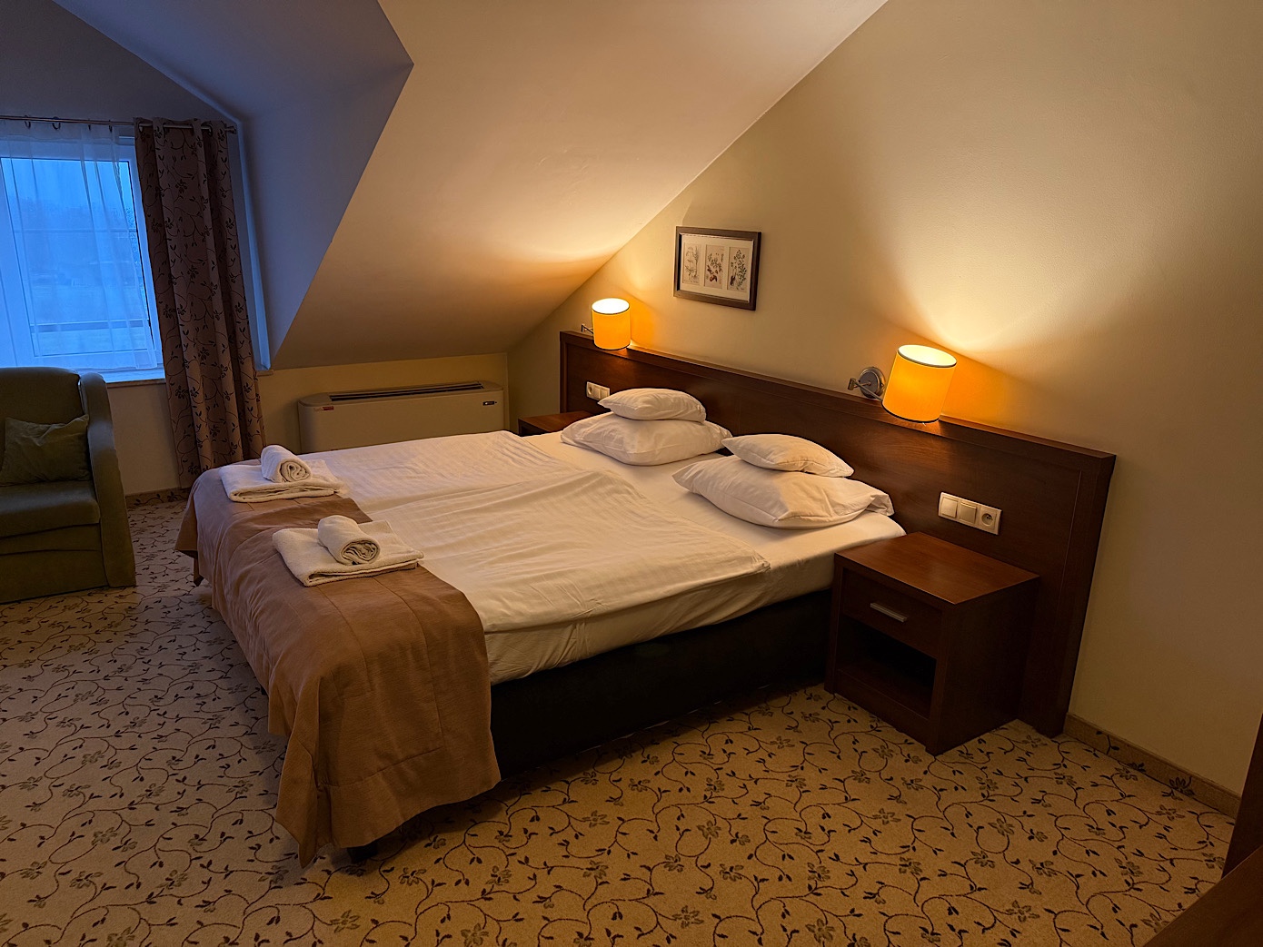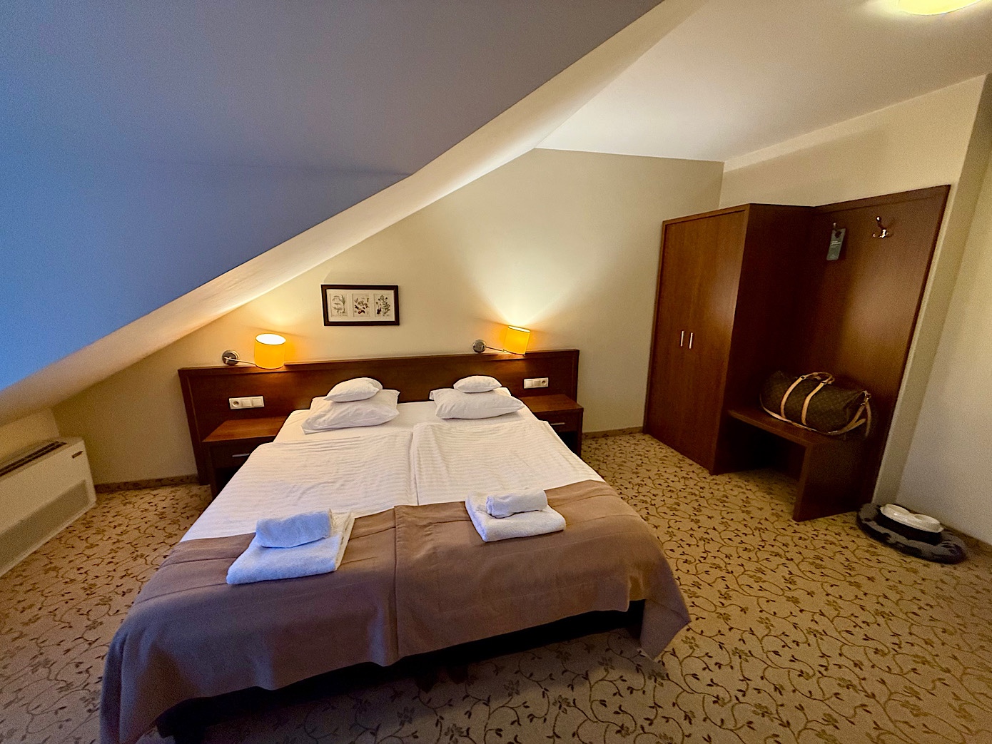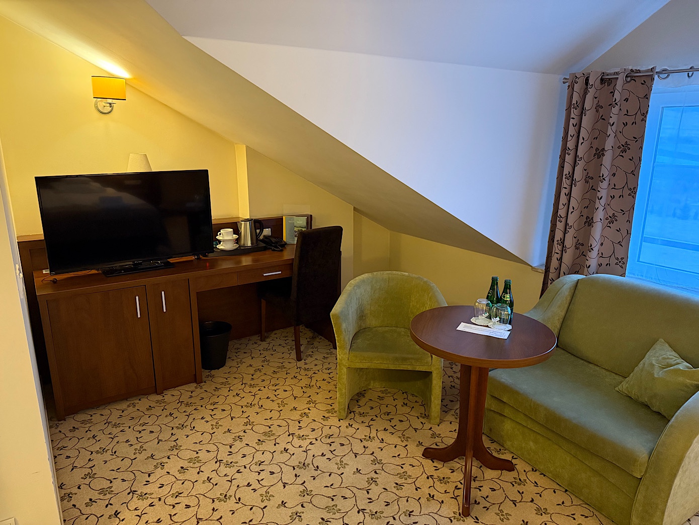 Grube zasłony sprzyjają dobremu snu, fotel i stolik kawowy są idealne na herbatę lub gazetę. O komfort wypoczynku dbają również: chłodzony minibarek, klimatyzacja oraz telewizor. Zmieszczono tu również sporą szafę. Plus za wygodnie rozmieszczone i łatwo dostępne gniazdka elektryczne.