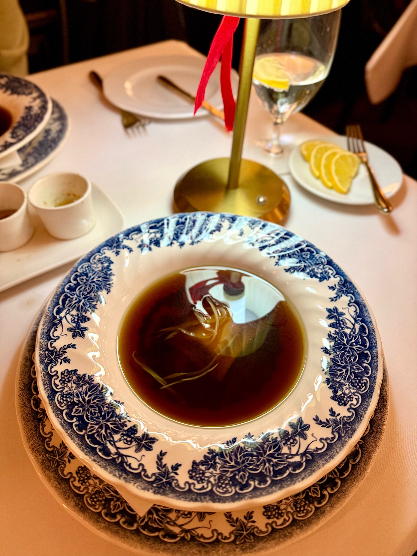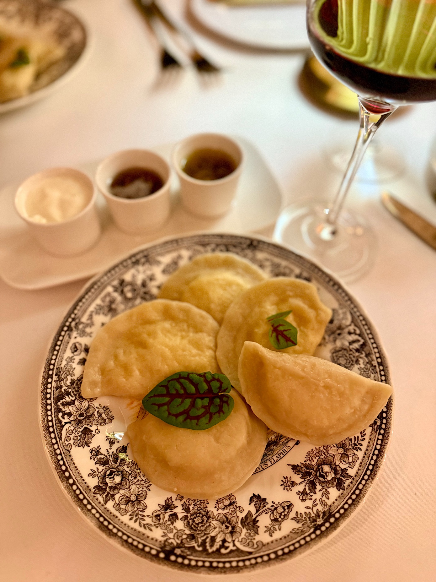 Powyższe zamówiliśmy ze wskazaniem do podziału. Zupę rozlano nam do przepięknych talerzy przy stoliku, podobnie miała się sprawa z pierogami, które zaserwowano ze śmietaną, cebulką oraz skwarkami. Były bardzo dobre, ale za żadne skarby nie jestem w stanie usprawiedliwić ich ogromnej ceny.