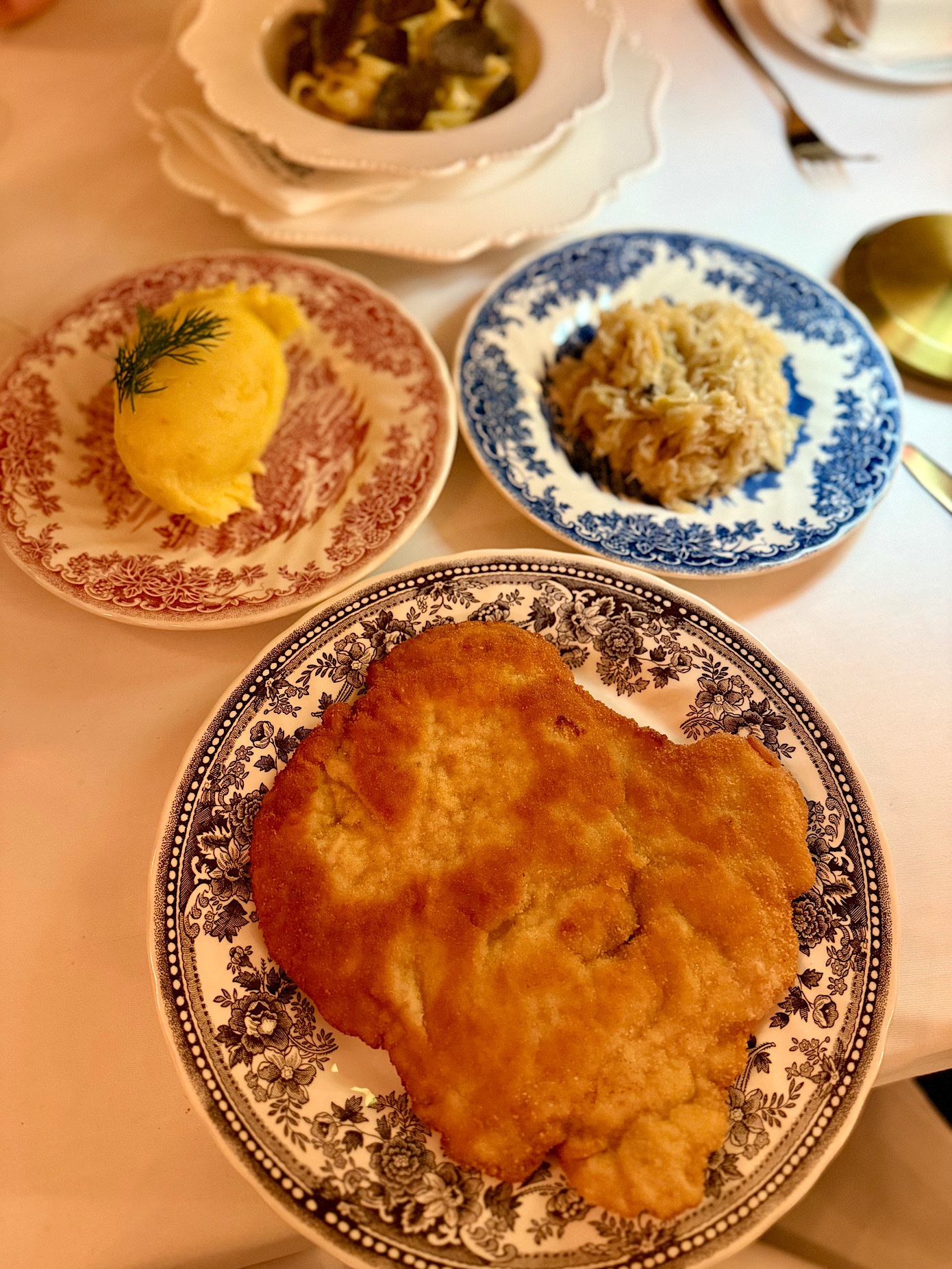 Dania główne zaordynowaliśmy z kompletnie innych rejonów. Ja skusiłem się na schabowego (86 PLN), J. tagliatelle ze świeżą czarną truflą (146 PLN).
