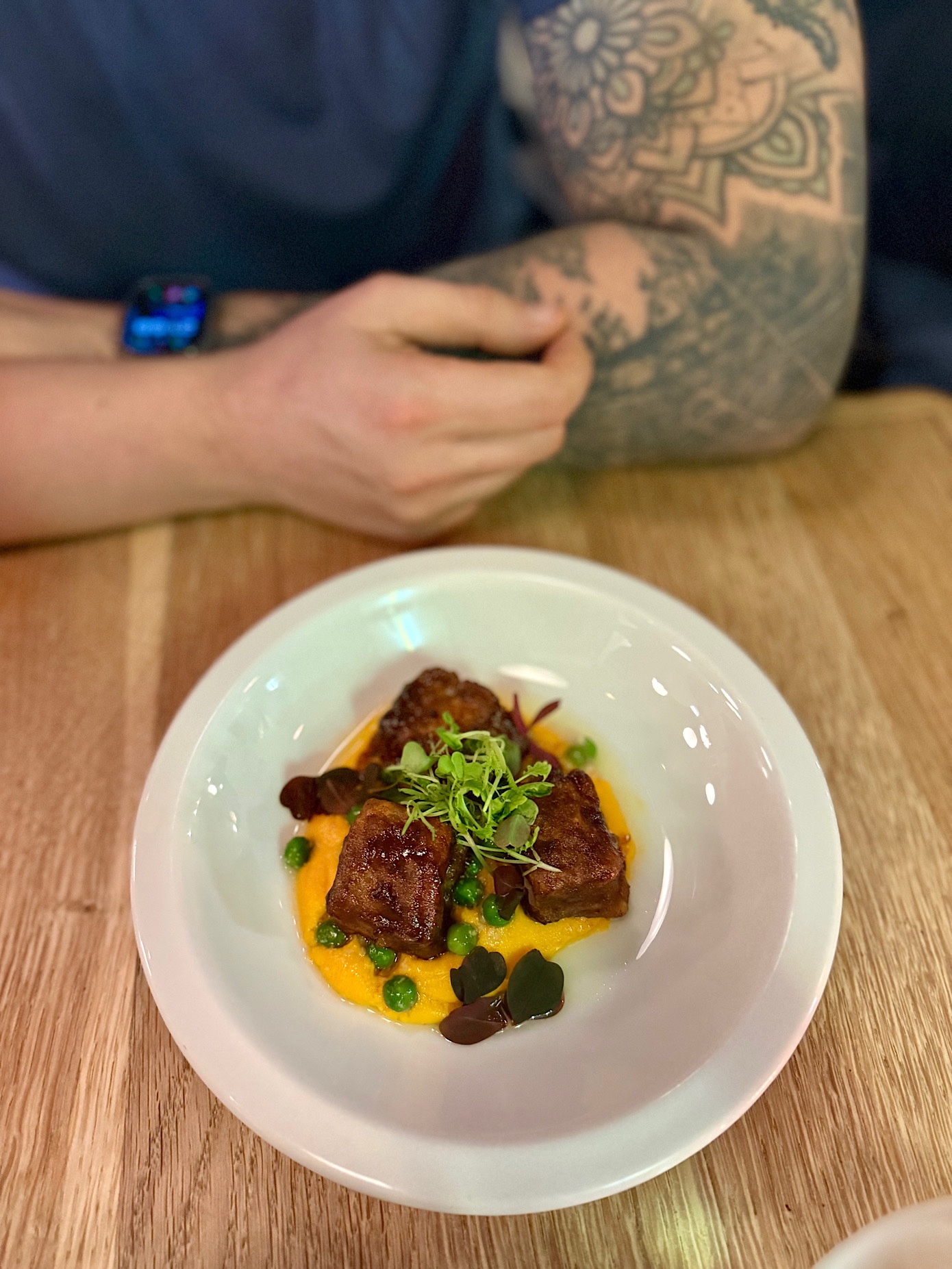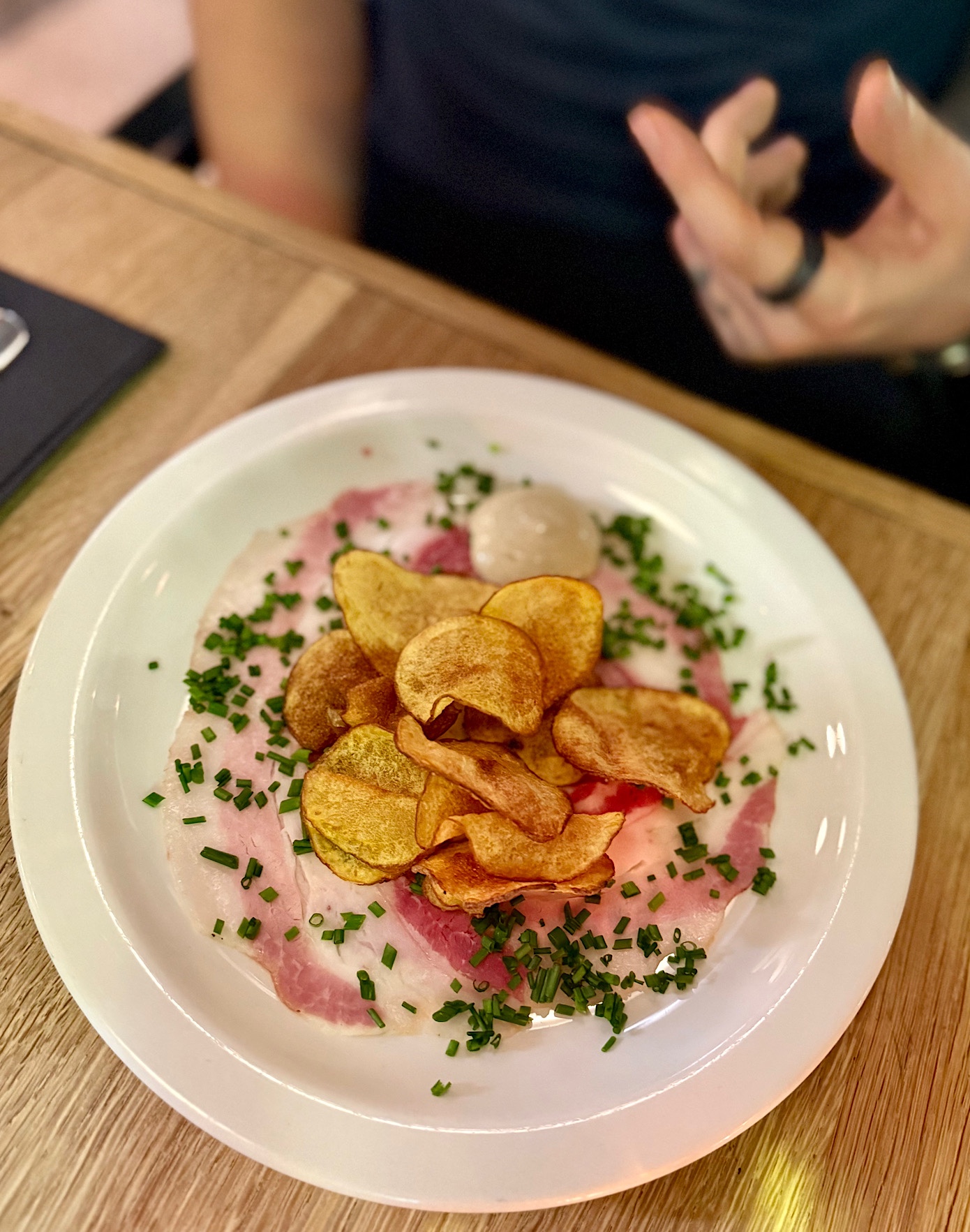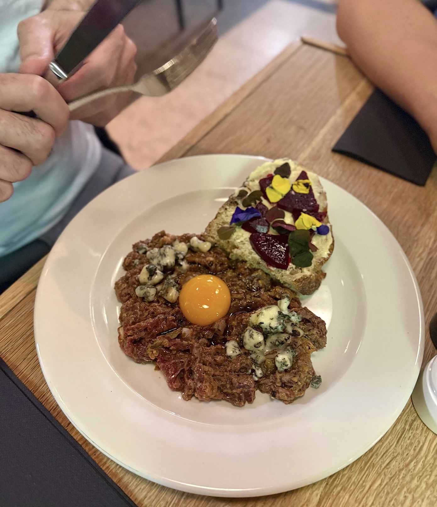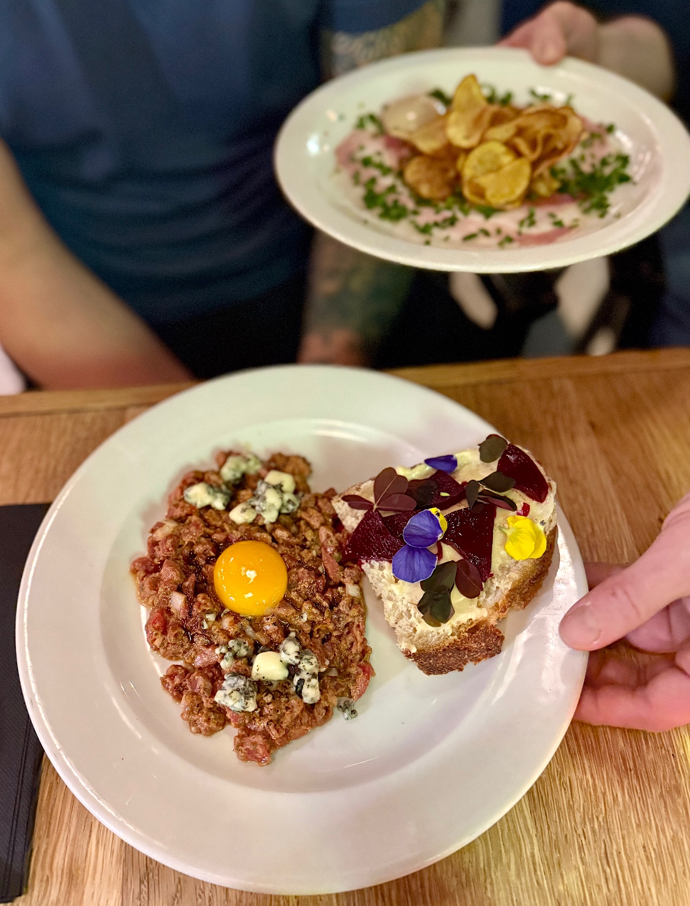 - R. – tatar z grubokrojonej koniny z bagietką korzenną wraz z kremem pomarańczowym, słoniną oraz żółtkiem (25 PLN). Zjadł do zera, ale skwitował iż nie był to najlepszy tatar jaki jadł dotychczas.