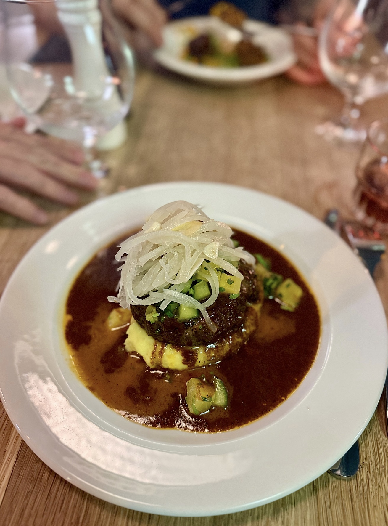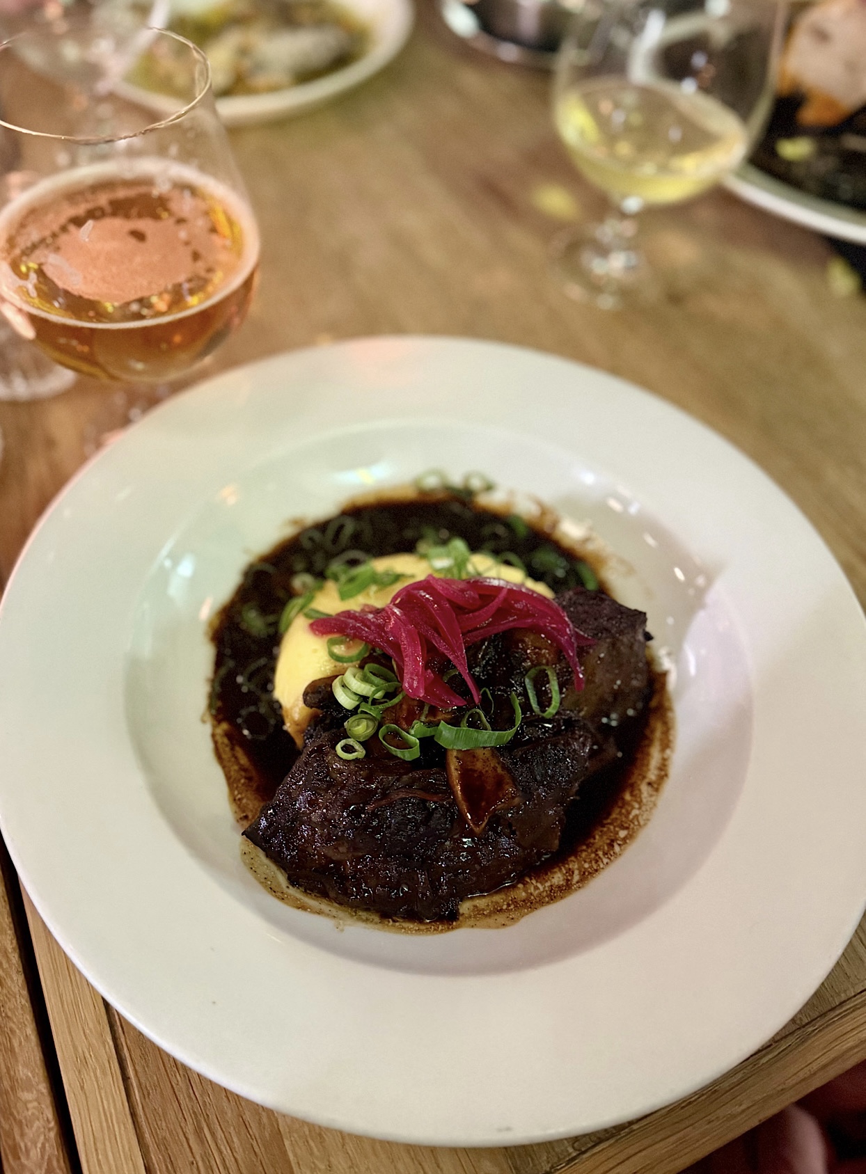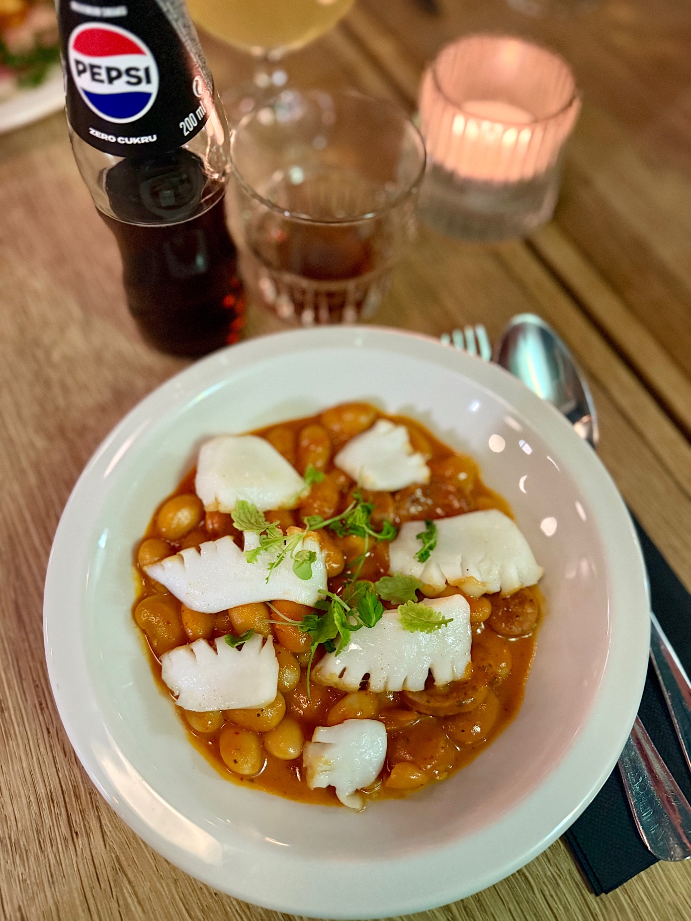 Stek rzeźnika / kukurydziane puree / olej z pestek dyni / szalotka / pak-choy / masło kaparowe z anchois 39 PLN. Mięso wołowe z okolic podbrzusza (pomiędzy nerkami a przeponą) wysmażono idealnie wg zamówienia czyli medium. Było miękkie, nieżylaste, kruche, bardzo soczyste i pachnące. Uwielbiam szalotkę i pak-choy, nie zawiodłem się i w tym temacie. Słodkie puree fajnie grało z całą kompozycją, prażone pestki dyni wesoło strzelały podczas gryzienia. Same plusy. Nie mogę powiedzieć ani jednego złego słowa – szukam w głowie co mi nie grało , ale nie jestem w stanie do niczego się przyczepić.
