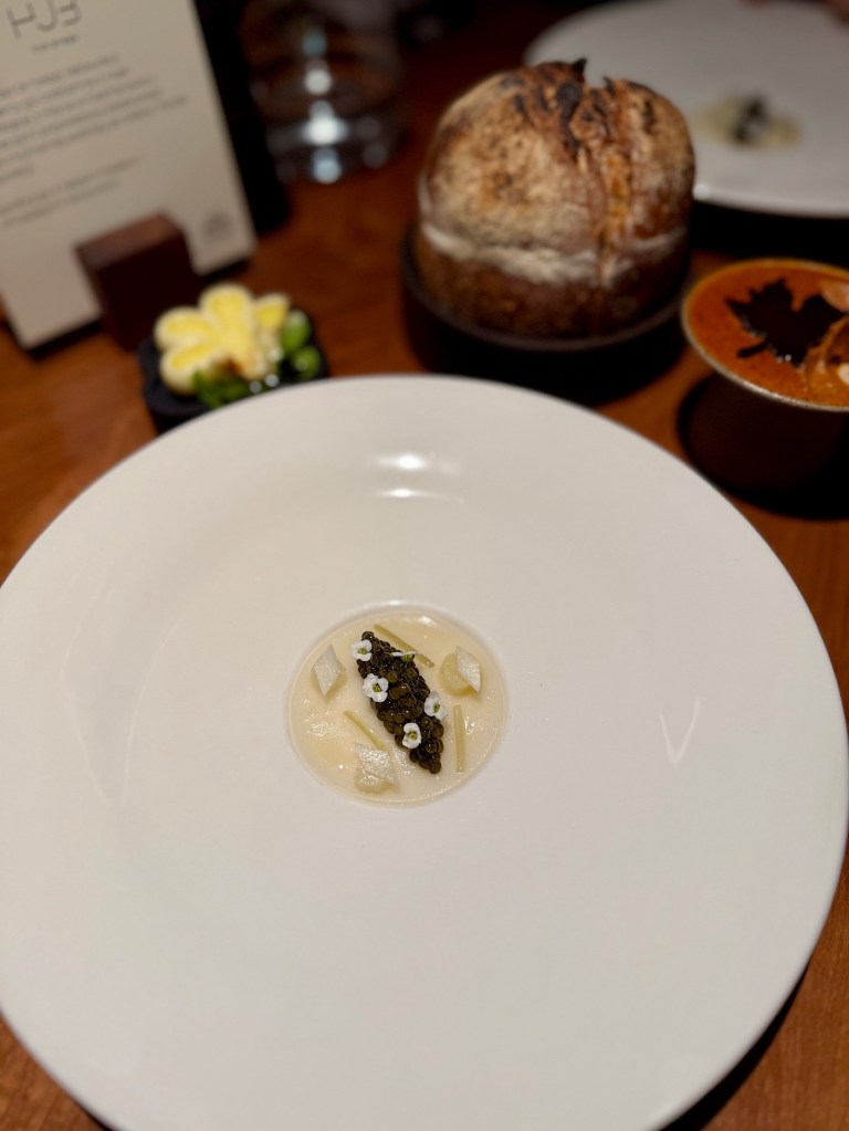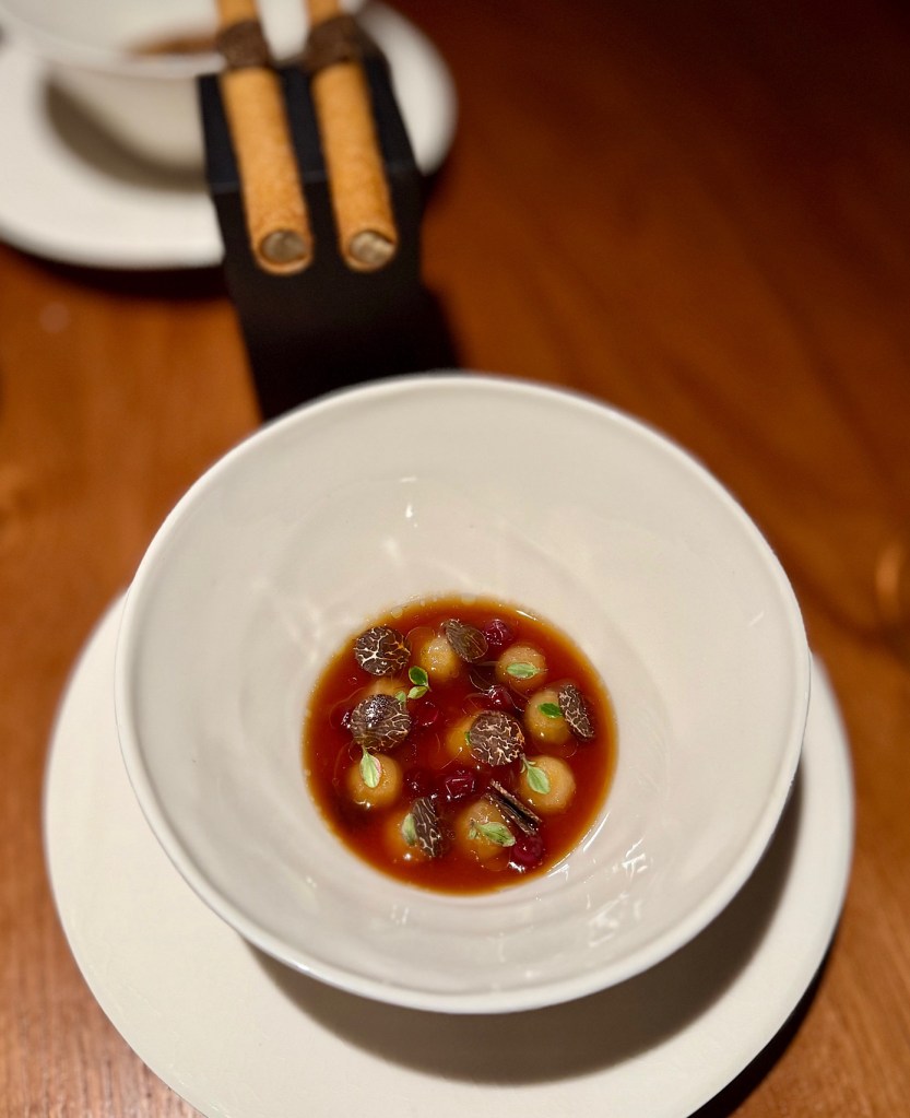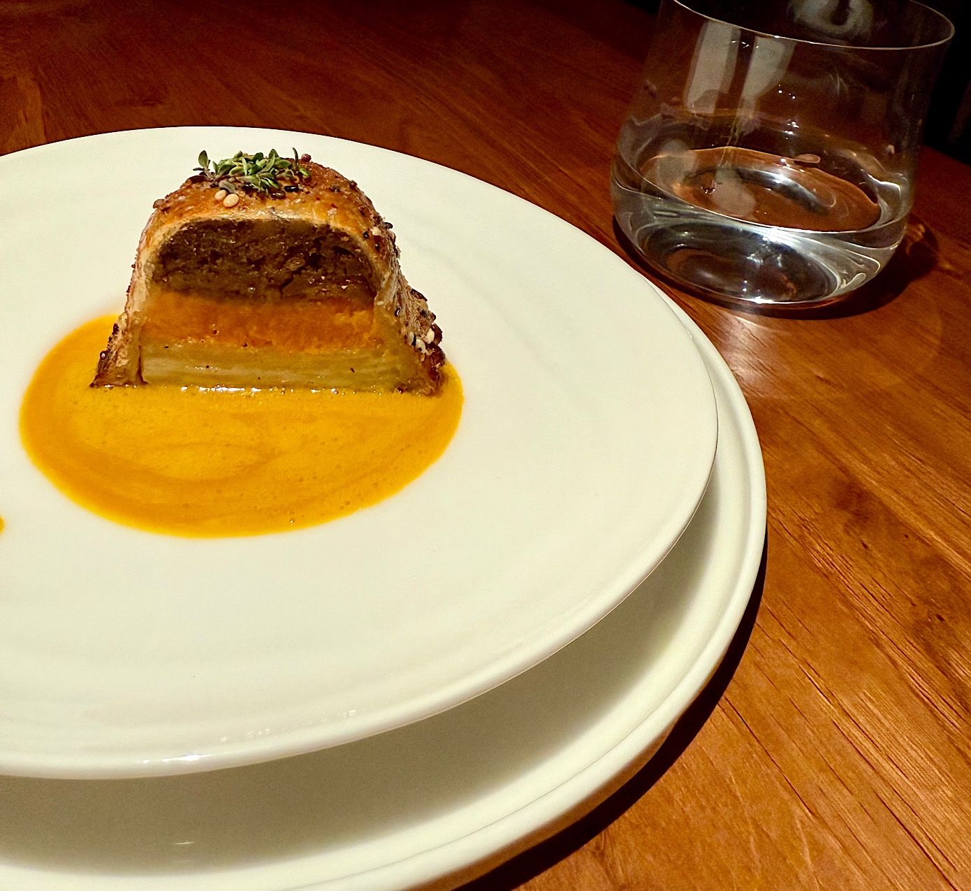 Po krótkiej przerwie podano dorsza skrei, rzepę daikon, oscietrę, a w opcji wegetariańskiej trzypoziomowego wellingotona z dynią, kasztanami i ziemniakami.