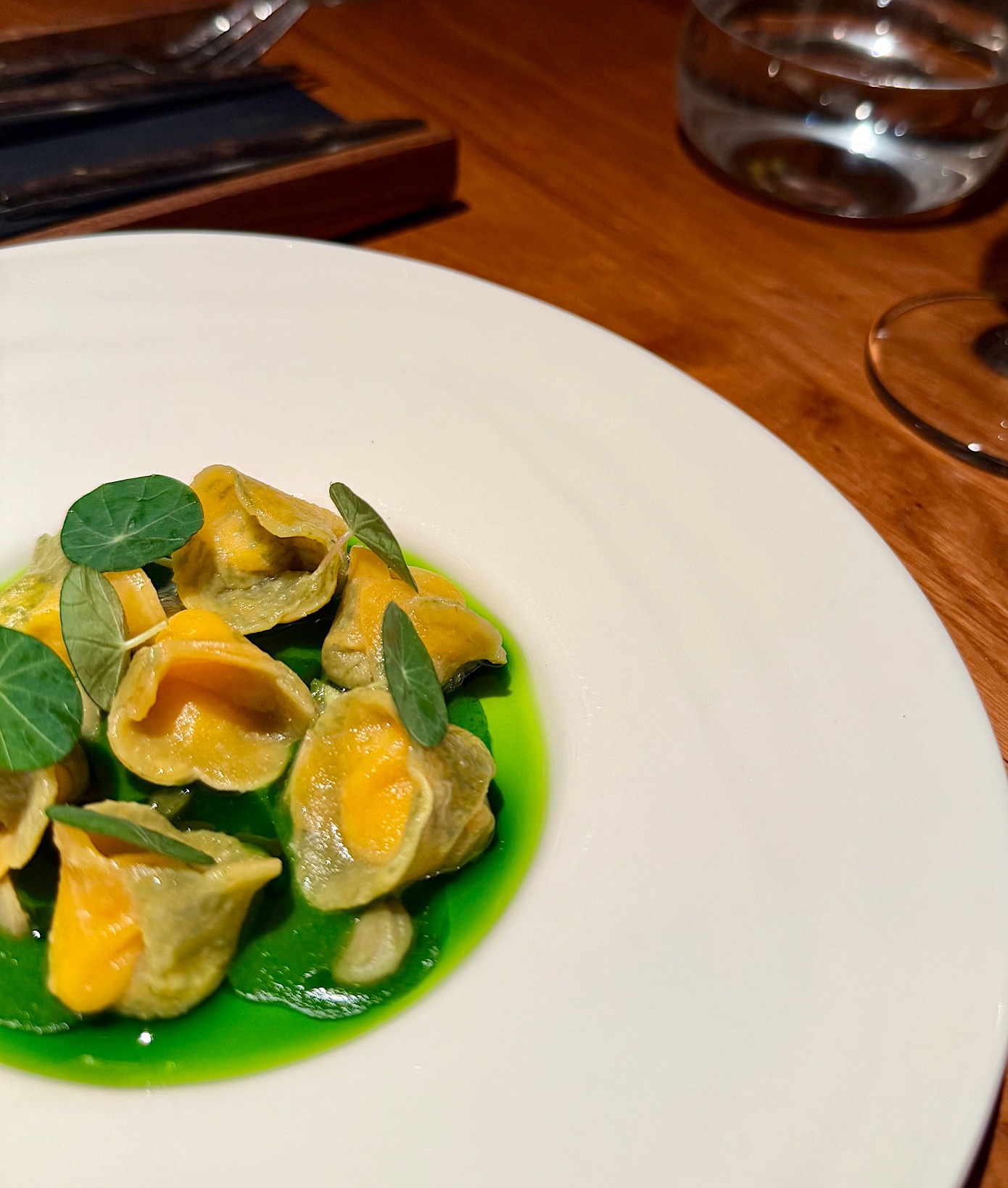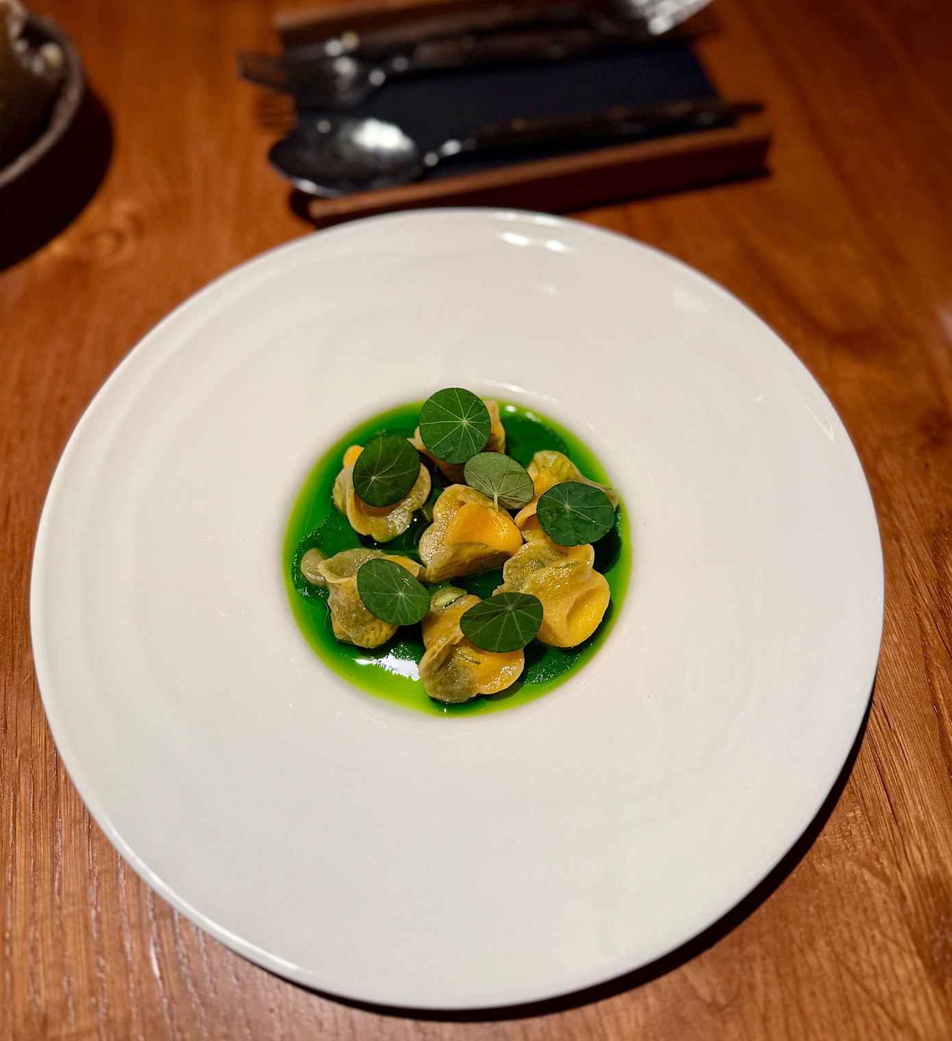 Kawalkadę dań głównych otworzyły pierogi, czosnek niedźwiedzi, twaróg i nasturcja.