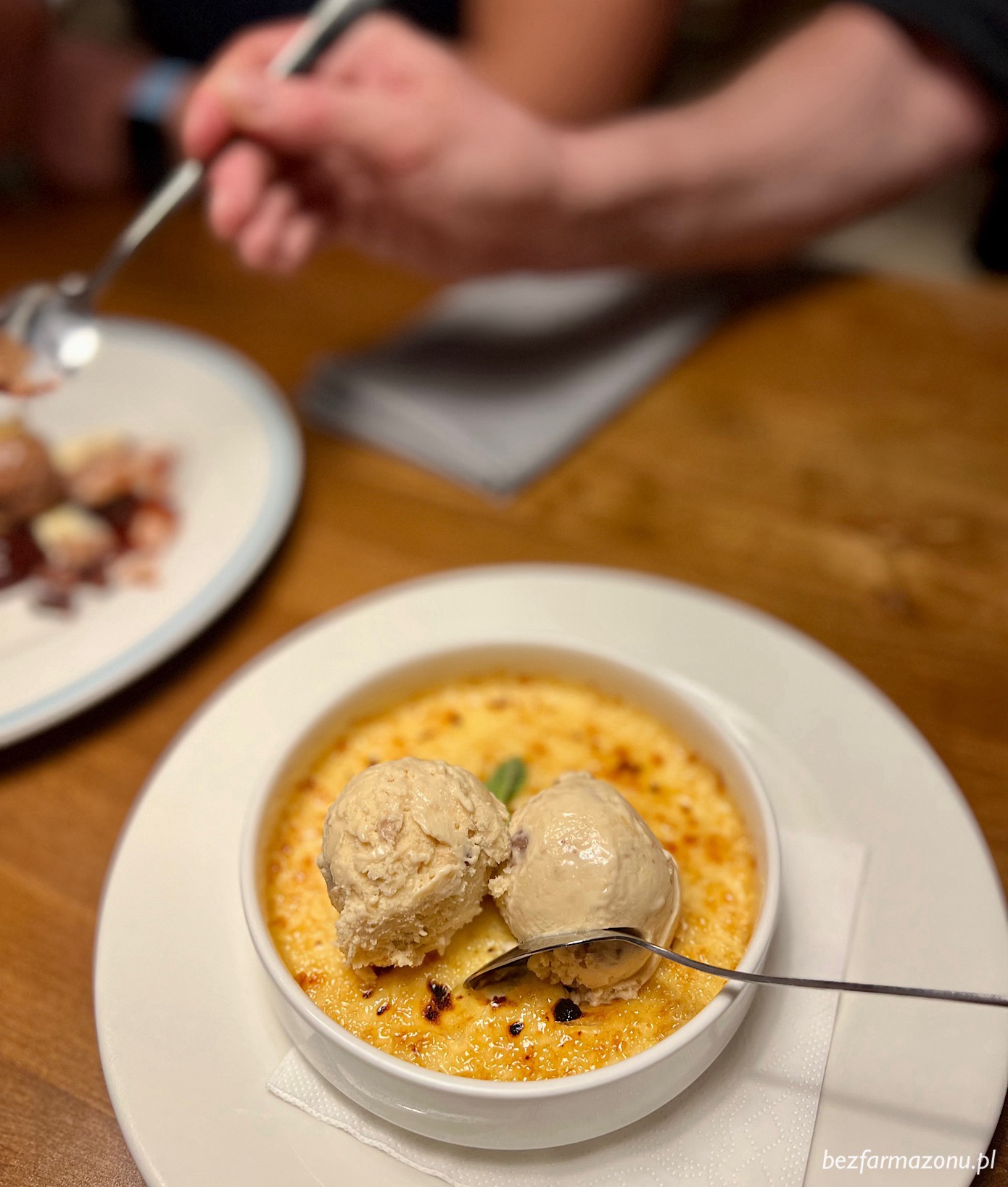 Creme brule z ciasteczkowymi lodami, mus z gorzkiej czekolady ze śliwkami i pistacjami, parzony sernik z malinami i kruszonką – wszystkie w cenie 29 złotych, każdy świetny – ciężko wybrać faworyta.