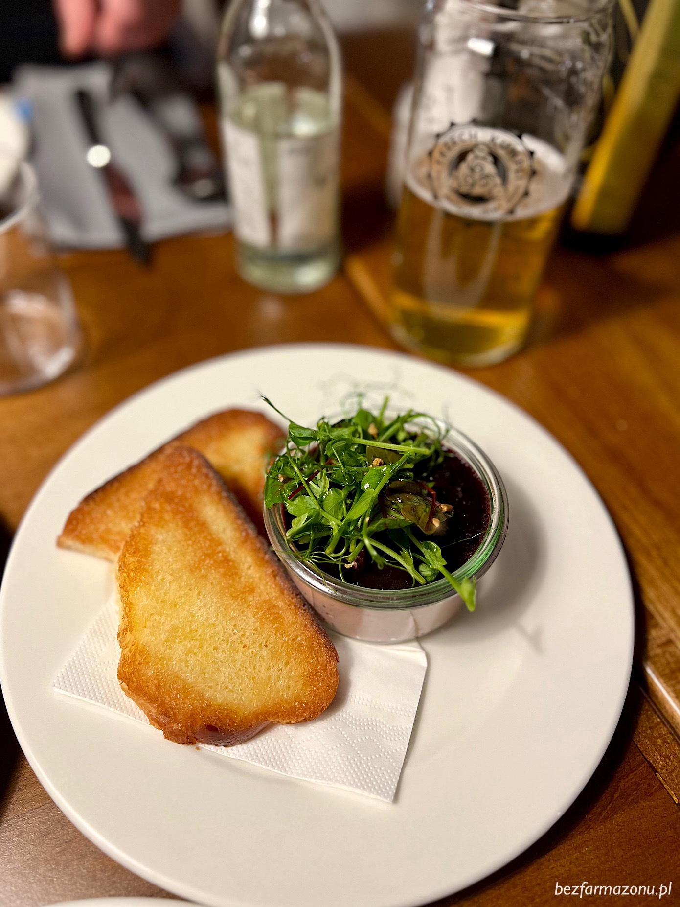 • mus z kaczych wątróbek z malinowym sosem wraz z maślanym, chrupiącym pieczywem – kolega ze Słowacji nie szczędził mu pochwał