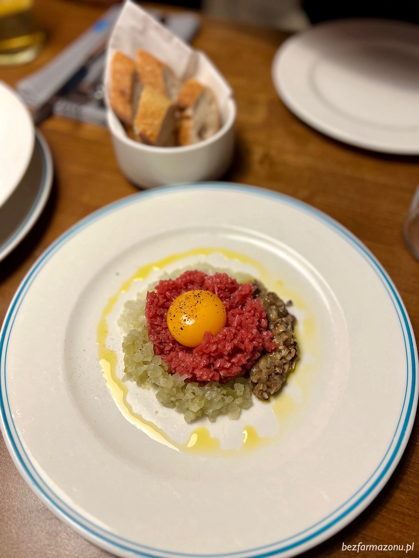 • tatar z polędwicy wołowej (34 PLN) o wyjątkowej perlistej strukturze. Mięso doskonałe plus nieprzekombinowane dodatki. Całość idealnie doprawiona. Cudo.