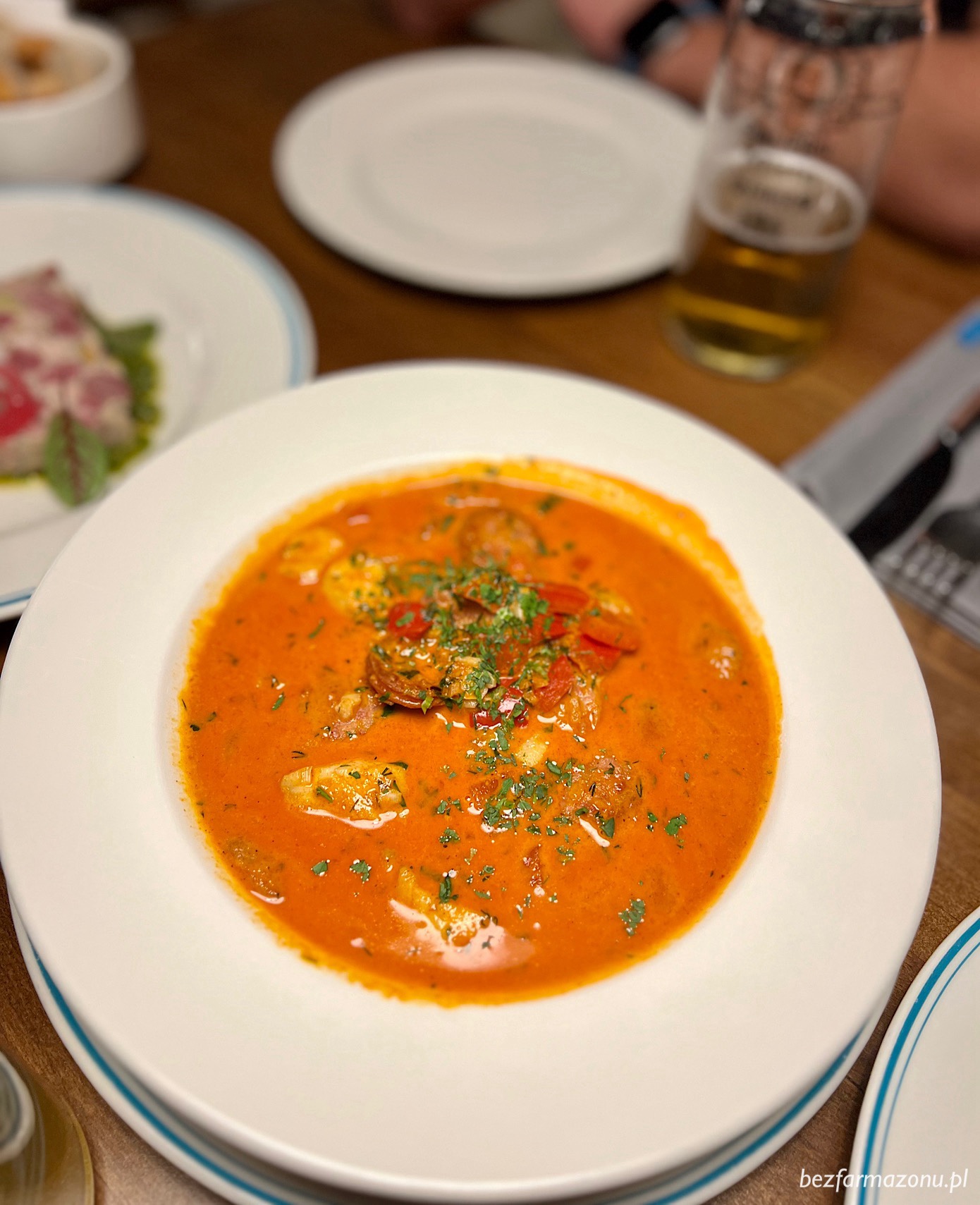 Tatar z polędwicy wołowej (49 PLN) wraz z fenomenalną zupą z kawałkami dorsza i białą kiełbasą (36 PLN) również przeniosł nas do przeszłości. Pierwszy do bólu klasyczny, druga wręcz przeciwnie – pomysłowa, kremowa, gorąca i rozpalająca zmysły.