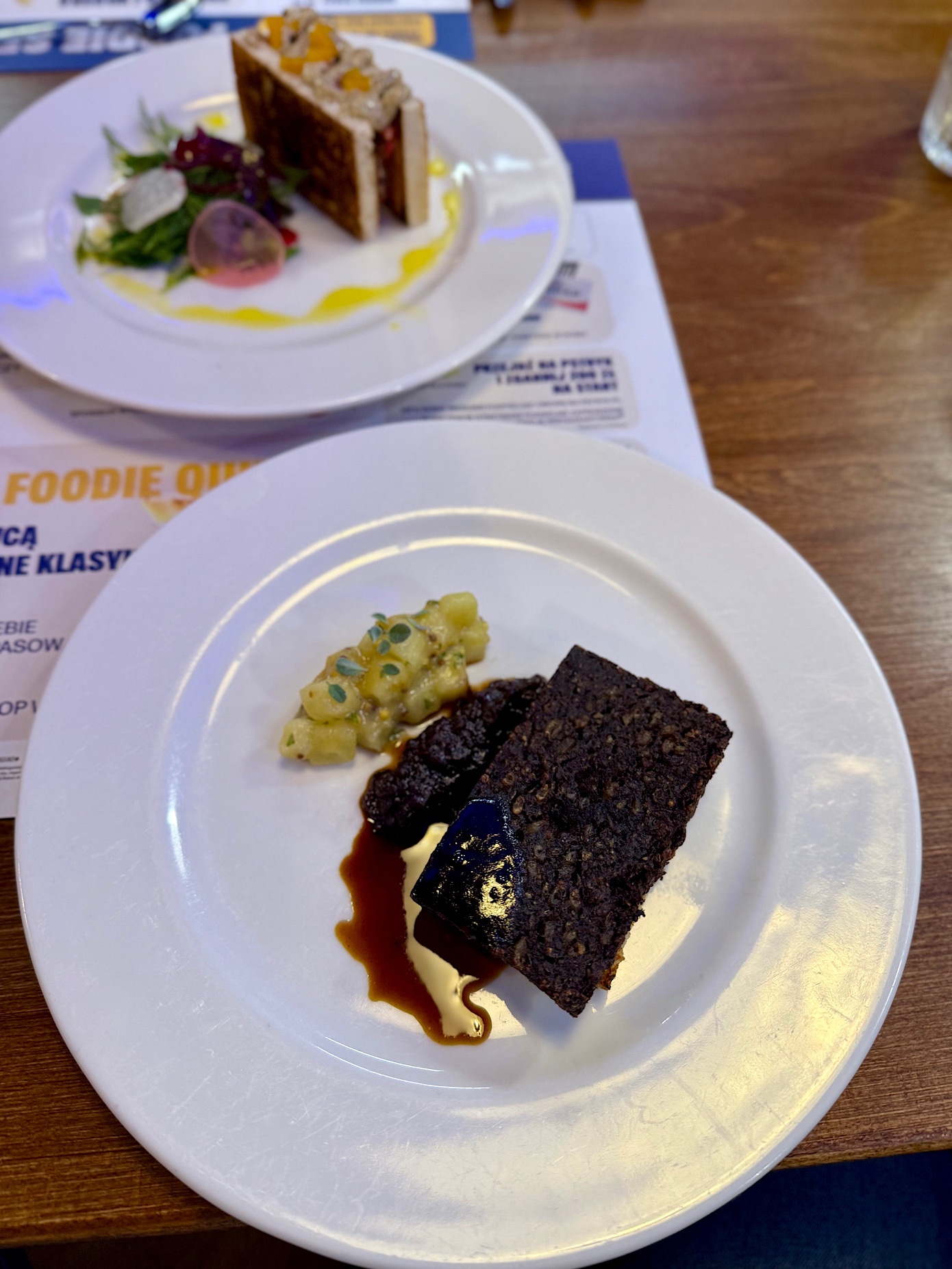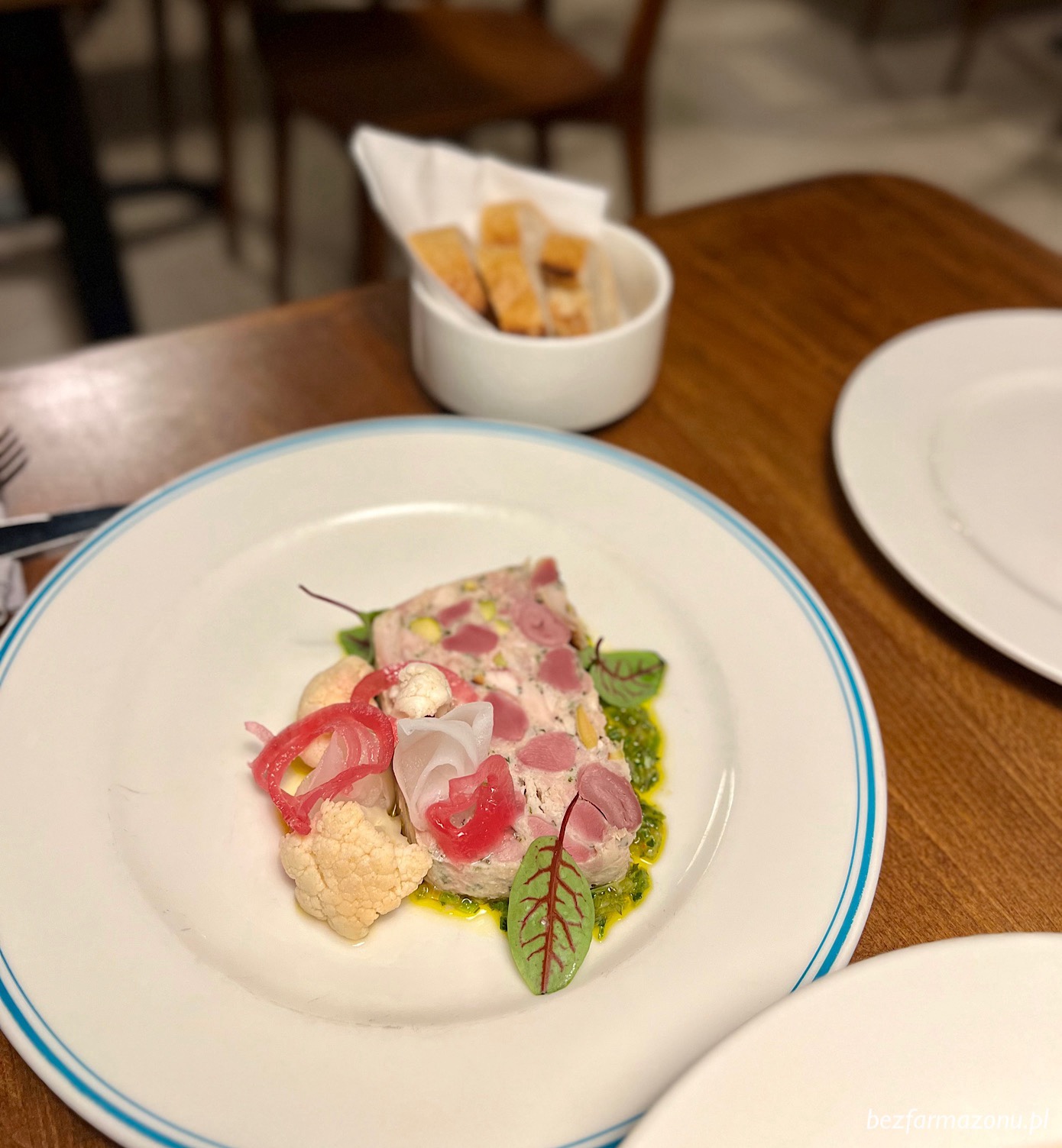 Terrina drobiowa z piklami (36 PLN) i pate z kaczki ze słodko – cierpką galaretką z czeremchy (39 PLN) przypomniały stare dobre czasy funkcjonowania restauracji jeszcze na Rynku Głównym.